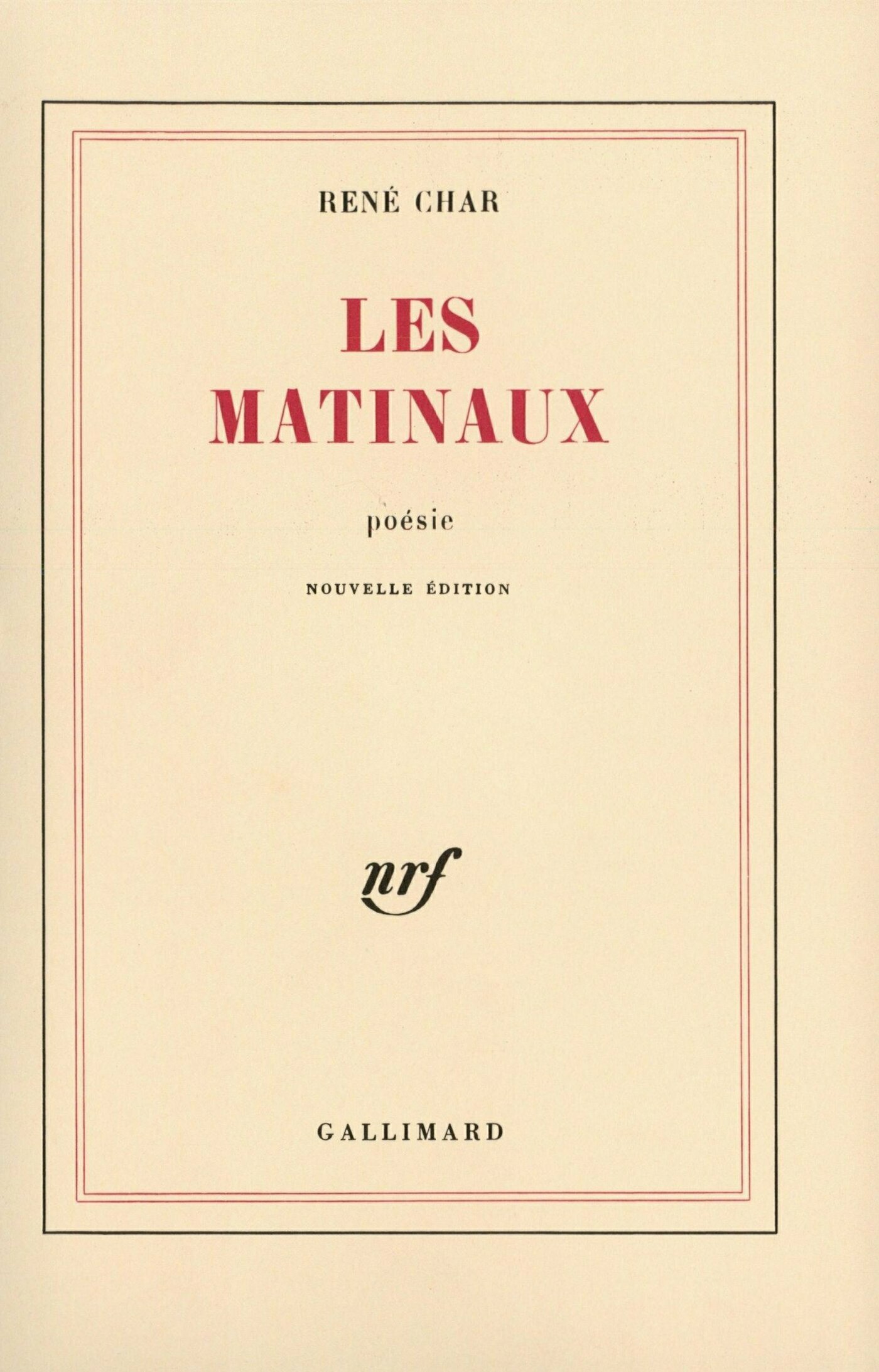 'Combien souffre ce monde, pour devenir celui de l'homme, d'être façonné entre les quatre murs d'un livre ! Qu'il soit ensuite remis aux mains de spéculateurs et d'extravagants qui le pressent d'avancer plus vite que son propre mouvement, comment ne pas voir là plus que de la malchance ? Combattre vaille que vaille cette fatalité à l'aide de sa magie, ouvrir dans l'aile de la route, de ce qui en tient lieu, d'insatiables randonnées, c'est la tâche des Matinaux. La mort n'est qu'un sommeil entier et pur avec le signe plus qui le pilote et l'aide à fendre le flot du devenir. Qu'as-tu à t'alarmer de ton état alluvial ? Cesse de prendre la branche pour le tronc et la racine pour le vide. C'est un petit commencement.' René Char.