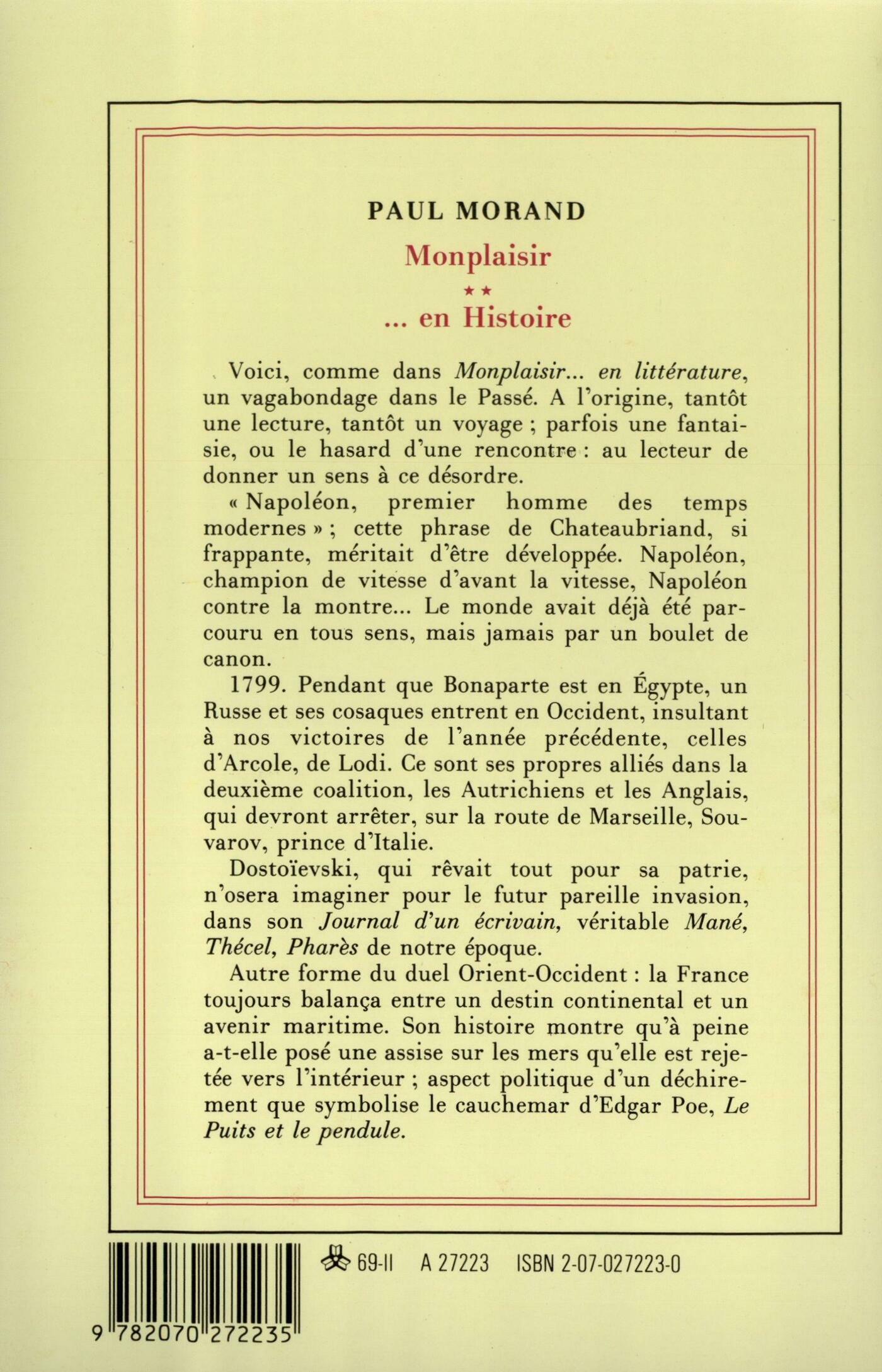 Voici, comme dans Monplaisir... en littérature, un vagabondage dans le Passé. À l'origine, tantôt une lecture, tantôt un voyage ; parfois une fantaisie, ou le hasard d'une rencontre : au lecteur de donner un sens à ce désordre. "Napoléon, premier homme des temps modernes" ; cette phrase de Chateaubriand, si frappante, méritait d'être développée. Napoléon, champion de vitesse d'avant la vitesse, Napoléon contre la montre... Le monde avait déjà été parcouru en tous sens, mais jamais par un boulet de canon. 1799. Pendant que Bonaparte est en Égypte, un Russe et ses cosaques entrent en Occident, insultant à nos victoires de l'année précédente, celles d'Arcole, de Lodi. Ce sont ses propres alliés dans la deuxième coalition, les Autrichiens et les Anglais, qui devront arrêter, sur la route de Marseille, Souvarov, prince d'Italie. Dostoïevski, qui rêvait tout pour sa patrie, n'osera imaginer pour le futur pareille invasion, dans son Journal d'un écrivain, véritable Mané, Thécel, Pharès de notre époque. Autre forme du duel Orient-Occident : la France toujours balança entre un destin continental et un avenir maritime. Son histoire montre qu'à peine a-t-elle posé une assise sur les mers qu'elle est rejetée vers l'intérieur ; aspect politique d'un déchirement que symbolise le cauchemar d'Edgar Poe, Le Puits et le pendule.