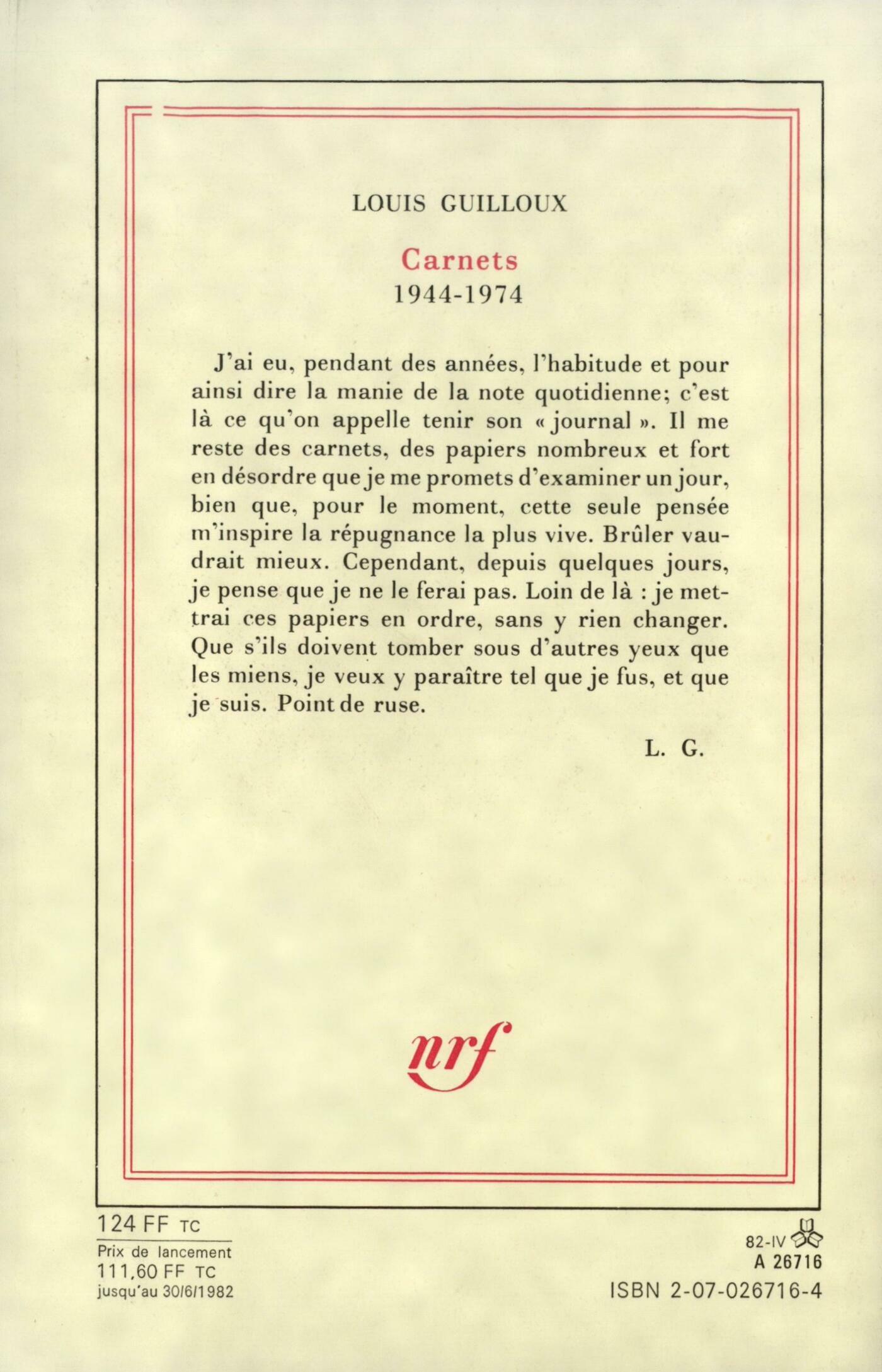 Le premier tome des Carnets de Louis Guilloux concernait les années 1921 à 1944. Nous voci maintenant au lendemain de la Libération. Guilloux séjourne plus souvent à Paris, voyage à travers l'Europe, se fait de nouveaux amis, notamment Albert Camus. Témoignage passionnant à la fois par les choses vues et par la qualité de celui qui les voit, sa chaleur, sa promptitude aussi à reconnaître la détresse humaine. Le premier tome des Carnets ressemblait beaucoup à un instrument de travail : des notes, des matériaux qui serviraient un jour au romancier. Le second est plus proche du journal intime. Guilloux s'explique dans ses Carnets mêmes sur les raisons qui lui faisaient souhaiter qu'ils soient publiés un jour : "J'ai eu, pendant des années, l'habitude et pour ainsi dire la manie de la note quotidienne ; c'est là ce qu'on appelle tenir son "journal". Il me reste des carnets, des papiers nombreux et fort en désordre que je me promets d'examiner un jour, bien que, pour le moment, cette seule pensée m'inspire la répugnance la plus vive. Brûler vaudrait mieux. Cependant, depuis quelques jours, je pense que je ne le ferai pas. Loin de là : je mettrai ces papiers en ordre, sans y rien changer. Que s'ils doivent tomber sous d'autres yeux que les miens, je veux y paraître tel que je fus, et que je suis. Point de ruse."