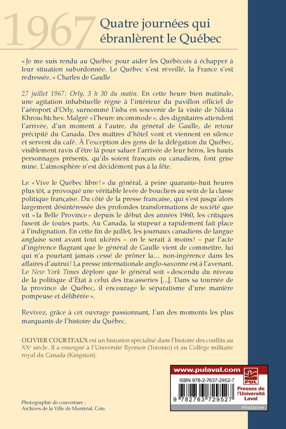 "D’un geste, le maire montre le chemin de la réception, à droite. De Gaulle, instinctivement, comme attiré par la clameur populaire, se porte sur la gauche, vers le fameux balcon de pierre. Sous le regard abasourdi de Jean Drapeau qui ne sait quoi faire, Durand tente une intervention: «Mon Général, ce n’est pas à ce balcon que vous devez prendre la parole. » Ce à quoi de Gaulle répond sur un ton qui n’admet pas de réplique: «Mais il faut bien que je leur dise quelque chose, à tous ces gens qui m’appellent.» En quelques enjambées, il atteint la porte-fenêtre qui le sépare du balcon. Drapeau le rejoint, presque en courant, et lui explique, à bout de souffle, que, de toute façon, sans micro, il ne sera pas possible à la foule de l’entendre. «Et ça, alors, qu’est-ce que c’est?», réplique de Gaulle qui vient d’apercevoir, à contre-jour, la forme du gros micro à deux branches installé puis débranché, le matin même, par le technicien de Radio-Canada. « C’est un micro, en effet », concède Drapeau, avant d’ajouter : « Mais il n’est pas branché.» Le général semble hésiter un instant. C’est alors que le technicien, qui paraît avoir développé un don d’ubiquité étonnant, surgit de la pénombre, comme par enchantement: «Ce n’est rien, Monsieur le Maire, je peux aussi bien le rebrancher. » Et sans attendre la réponse, il se met au travail tandis que de Gaulle attend patiemment que l’on veuille bien ouvrir la porte-fenêtre. Drapeau a perdu la partie."" Pour tout savoir du contexte, de l’avant et de l’après de cette visite à nulle autre pareille, il y a ce petit livre merveilleux de l’historien Olivier Courteaux « Quatre journées qui ébranlèrent le Québec » dans lequel il nous dit tout de ce qui s’est passé dans les coulisses."Culturehebdo.com, octobre 2017