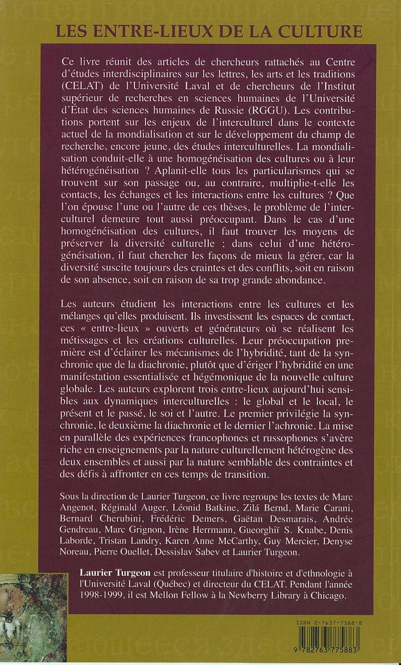 Les auteurs étudient les interactions entre les cultures et les mélanges qu’elles produisent. Ils investissent les espaces de contact, ces « entre-lieux » ouverts et générateurs où se réalisent les métissages et les créations culturelles. Leur préoccupation première est d’éclairer les mécanismes de l’hybridité, tant de la synchronie que de la diachronie, plutôt que d’ériger l’hybridité en une manifestation essentialisée et hégémonique de la nouvelle culture globale. Les auteurs explorent trois entre-lieux aujourd’hui sensibles aux dynamiques interculturelles : le global et le local, le présent et le passé, le soi et l’autre. Le premier privilégie la synchronie, le deuxième la diachronie et le dernier l’achronie. La mise en parallèle des expériences francophones et russophones s’avère riche en enseignements par la nature culturellement hétérogène des deux ensembles et aussi par la nature semblable des contraintes et des défis à affronter en ces temps de transition.