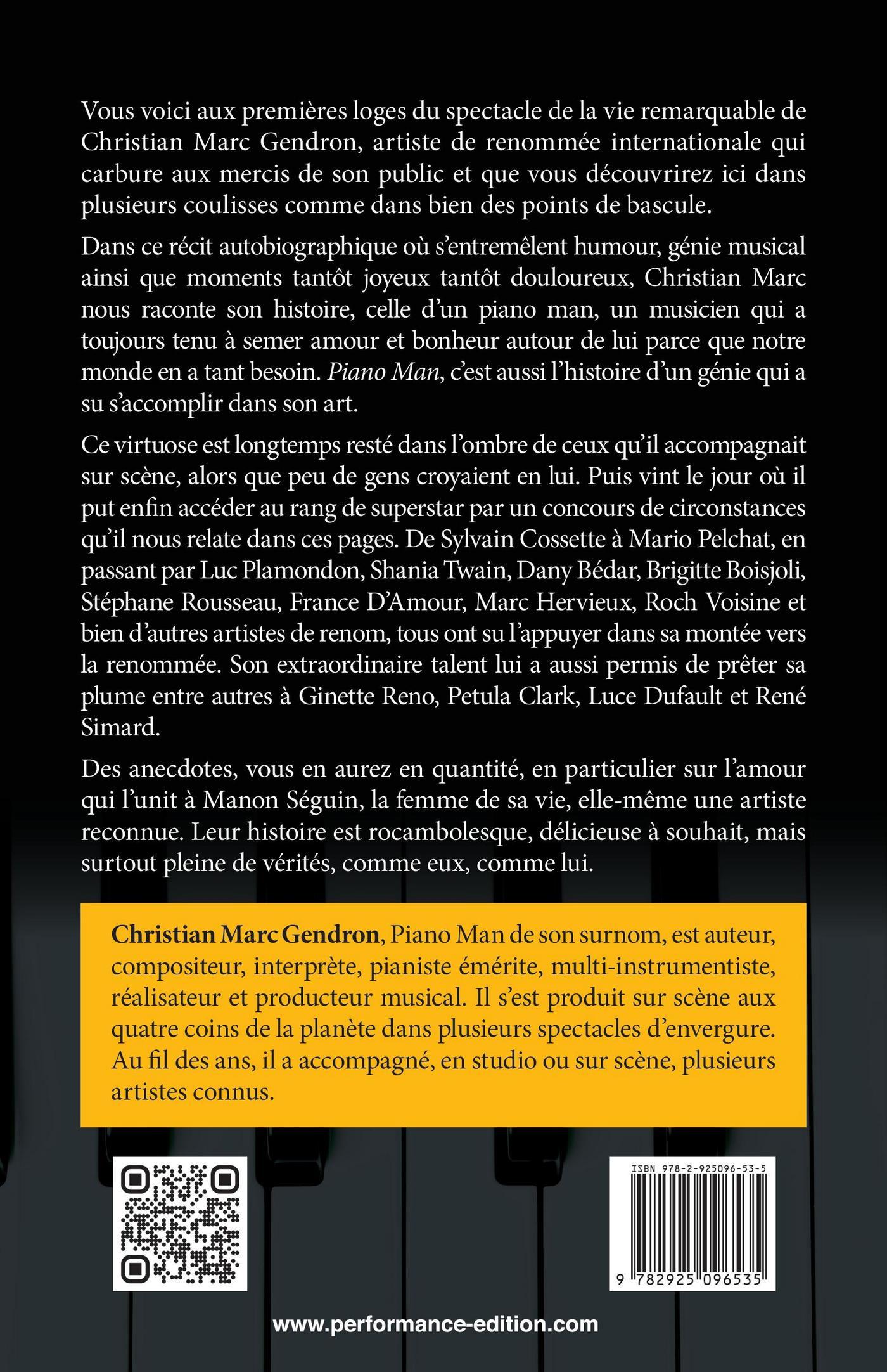 Vous voici aux premières loges du spectacle de la vie remarquable de Christian Marc Gendron, artiste de renommée internationale qui carbure aux mercis de son public et que vous découvrirez ici dans plusieurs coulisses comme dans bien des points de bascule.Dans ce récit autobiographique où s’entremêlent humour, génie musical ainsi que moments tantôt joyeux tantôt douloureux, Christian Marc nous raconte son histoire, celle d’un piano man, un musicien qui a toujours tenu à semer amour et bonheur autour de lui parce que notre monde en a tant besoin. Piano Man, c’est aussi l’histoire d’un génie qui a su s’accomplir dans son art.Ce virtuose est longtemps resté dans l’ombre de ceux qu’il accompagnait sur scène, alors que peu de gens croyaient en lui. Puis vint le jour où il put enfin accéder au rang de superstar par un concours de circonstances qu’il nous relate dans ces pages. De Sylvain Cossette à Mario Pelchat, en passant par Luc Plamondon, Shania Twain, Dany Bédar, Brigitte Boisjoli, Stéphane Rousseau, France D’Amour, Marc Hervieux, Roch Voisine et bien d’autres artistes de renom, tous ont su l’appuyer dans sa montée vers la renommée. Son extraordinaire talent lui a aussi permis de prêter sa plume entre autres à Ginette Reno, Petula Clark, Luce Dufault et René Simard.Des anecdotes, vous en aurez en quantité, en particulier sur l’amour qui l’unit à Manon Séguin, la femme de sa vie, elle-même une artiste reconnue. Leur histoire est rocambolesque, délicieuse à souhait, mais surtout pleine de vérités, comme eux, comme lui.