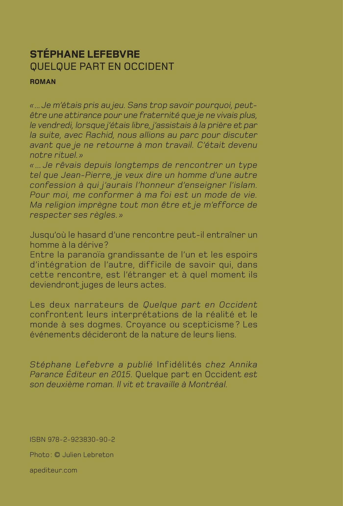 « ... Je m’étais pris au jeu. Sans trop savoir pourquoi, peut-être une attirance pour une fraternité que je ne vivais plus, le vendredi, lorsque j’étais libre, j’assistais à la prière et par la suite, avec Rachid, nous allions au parc pour discuter avant que je ne retourne à mon travail. C’était devenu notre rituel. »« ... Je rêvais depuis longtemps de rencontrer un type tel que Jean-Pierre, je veux dire un homme d’une autre confession à qui j’aurais l’honneur d’enseigner l’islam. Pour moi, me conformer à ma foi est un mode de vie. Ma religion imprègne tout mon être et je m’efforce de respecter ses règles. »Jusqu’où le hasard d’une rencontre peut-il entraîner un homme à la dérive ?Entre la paranoïa grandissante de l’un et les espoirs d’intégration de l’autre, difficile de savoir qui, dans cette rencontre, est l’étranger et à quel moment ils deviendront juges de leurs actes.Les deux narrateurs de Quelque part en Occident confrontent leurs interprétations de la réalité et le monde à ses dogmes. Croyance ou scepticisme ? Les événements décideront de la nature de leurs liens.