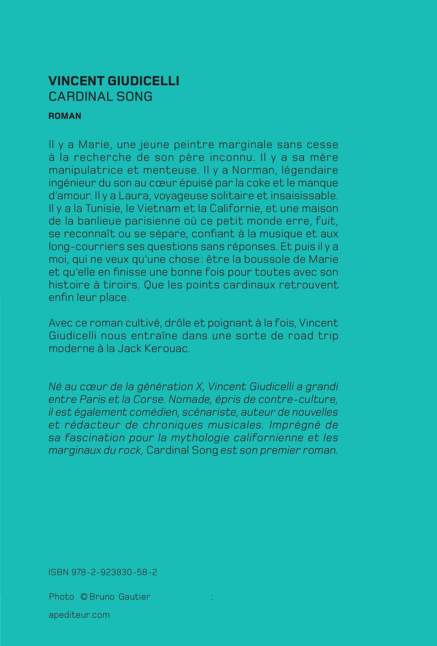 Il y a Marie, une jeune peintre marginale sans cesse à la recherche de son père inconnu. Il y a sa mère manipulatrice et menteuse. Il y a Norman, légendaire ingénieur du son au cœur épuisé par la coke et le manque d'amour. Il y a Laura, voyageuse solitaire et insaisissable.Il y a la Tunisie, le Vietnam et la Californie, et une maison de la banlieue parisienne où ce petit monde erre, fuit, se reconnaît ou se sépare, confiant à la musique et auxlong-courriers ses questions sans réponses.Et puis il y a moi, qui ne veux qu'une chose : être la boussole de Marie et qu'elle en finisse une bonne fois pour toutes avec son histoire à tiroirs. Que les points cardinauxretrouvent enfin leur place.Avec ce roman cultivé, drôle et poignant à la fois, Vincent Giudicelli nous entraîne dans une sorte de road trip moderne à la Jack Kerouac.