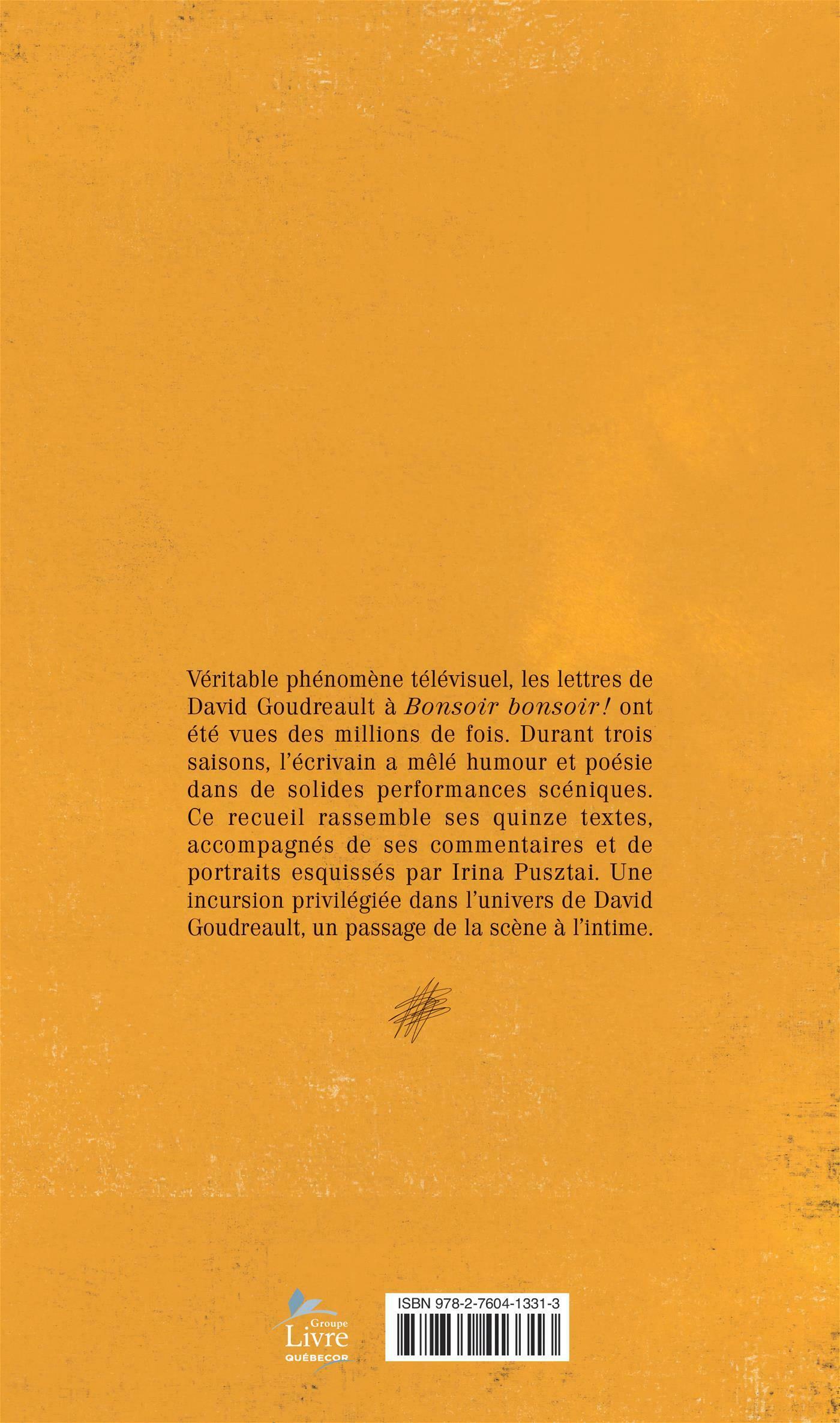 Véritable phénomène télévisuel, les lettres de David Goudreault à Bonsoir bonsoir ! ont été vues des millions de fois. Durant trois saisons, l'écrivain a mêlé humour et poésie dans de solides performances scéniques. Ce recueil rassemble ses quinze textes, accompagnés de ses commentaires et de portraits esquissés par Irina Pusztai. Une incursion privilégiée dans l'univers de David Goudreault, un passage de la scène à l'intime.