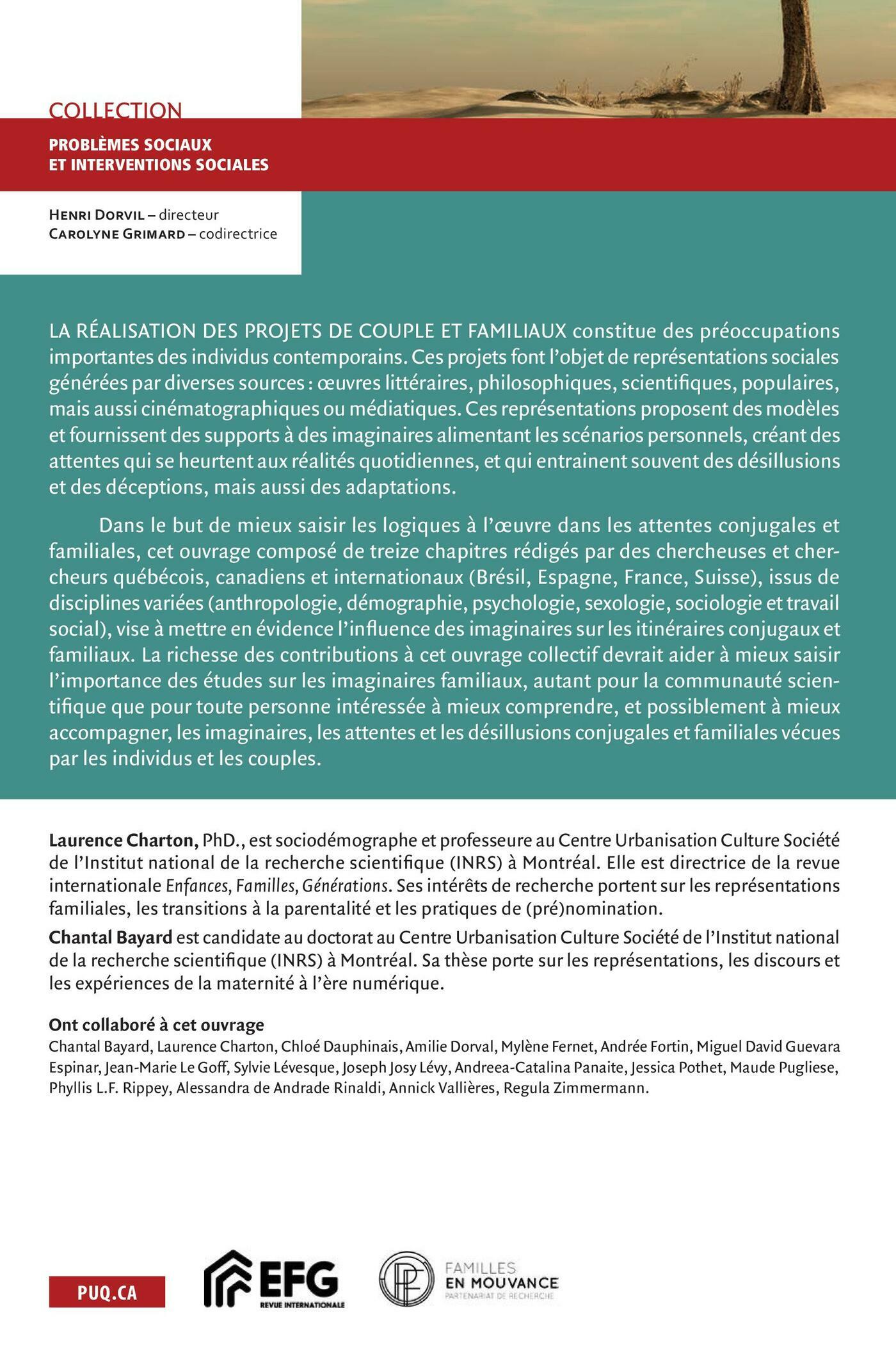 La réalisation des projets de couple et familiaux constitue des préoccupations importantes des individus contemporains. Ces projets font l’objet de représentations sociales générées par diverses sources : œuvres littéraires, philosophiques, scientifiques, populaires, mais aussi cinématographiques ou médiatiques. Ces représentations proposent des modèles et fournissent des supports à des imaginaires alimentant les scénarios personnels, créant des attentes qui se heurtent aux réalités quotidiennes, et qui entrainent souvent des désillusions et des déceptions, mais aussi des adaptations.Dans le but de mieux saisir les logiques à l’œuvre dans les attentes conjugales et familiales, cet ouvrage composé de treize chapitres rédigés par des chercheuses et chercheurs québécois, canadiens et internationaux (Brésil, Espagne, France, Suisse), issus de disciplines variées (anthropologie, démographie, psychologie, sexologie, sociologie et travail social), vise à mettre en évidence l’influence des imaginaires sur les itinéraires conjugaux et familiaux. La richesse des contributions à cet ouvrage collectif devrait aider à mieux saisir l’importance des études sur les imaginaires familiaux, autant pour la communauté scientifique que pour toute personne intéressée à mieux comprendre, et possiblement à mieux accompagner, les imaginaires, les attentes et les désillusions conjugales et familiales vécues par les individus et les couples.Laurence Charton, PhD., est sociodémographe et professeure au Centre Urbanisation Culture Société de l’Institut national de la recherche scientifique (INRS) à Montréal. Elle est directrice de la revue internationale Enfances, Familles, Générations. Ses intérêts de recherche portent sur les représentations familiales, les transitions à la parentalité et les pratiques de (pré)nomination.Chantal Bayard est candidate au doctorat au Centre Urbanisation Culture Société de l’Institut national de la recherche scientifique (INRS) à Montréal. Sa thèse porte sur les représentations, les discours et les expériences de la maternité à l’ère numérique.