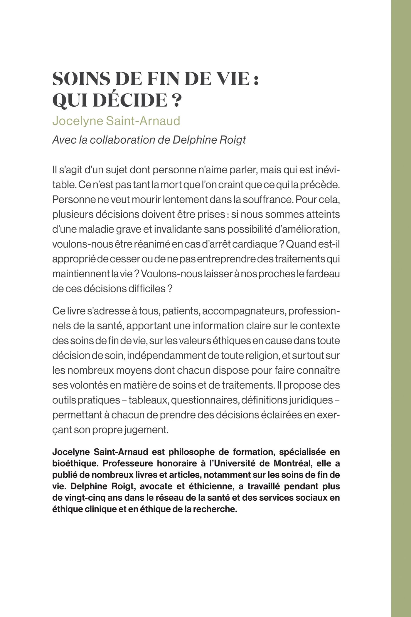 Il s’agit d’un sujet dont personne n’aime parler, mais qui est incontournable, car nul n’échappe à la mort. Tôt ou tard elle viendra nous chercher. Aussi bien que ça se passe pour le mieux. Ce n’est pas tant la mort que l’on craint que ce qui la précède. Personne ne veut mourir lentement dans la souffrance. Pour cela, plusieurs décisions doivent être prises: si nous sommes atteints d’une maladie grave et invalidante sans possibilité d’amélioration, voulons-nous être réanimé en cas d’arrêt cardiaque? Voulons-nous que tout soit tenté pour nous garder en vie? La médecine a les moyens de maintenir une vie dont les capacités sont minimales. Quand est-il approprié de cesser ou de ne pas entreprendre des traitements qui maintiennent la vie quand on est en fin de vie? Voulons-nous laisser à nos proches le fardeau de ces décisions difficiles? Ce livre a été conçu pour informer la population en général; il renseigne chacun des lecteurs sur le contexte des soins de fin de vie, sur les valeurs éthiques en cause dans toute décision de soin, indépendamment de toute religion, et surtout sur les nombreux moyens dont chacun dispose pour faire connaître ses volontés en matière de soins et de traitements. Il propose des outils pratiques – tableaux, questionnaires, définitions juridiques – permettant à chacun de prendre des décisions éclairées en exerçant son propre jugement. Il ouvre le dialogue entre les patients, leurs proches et les membres des équipes de soin sur des questions malheureusement souvent encore taboues.