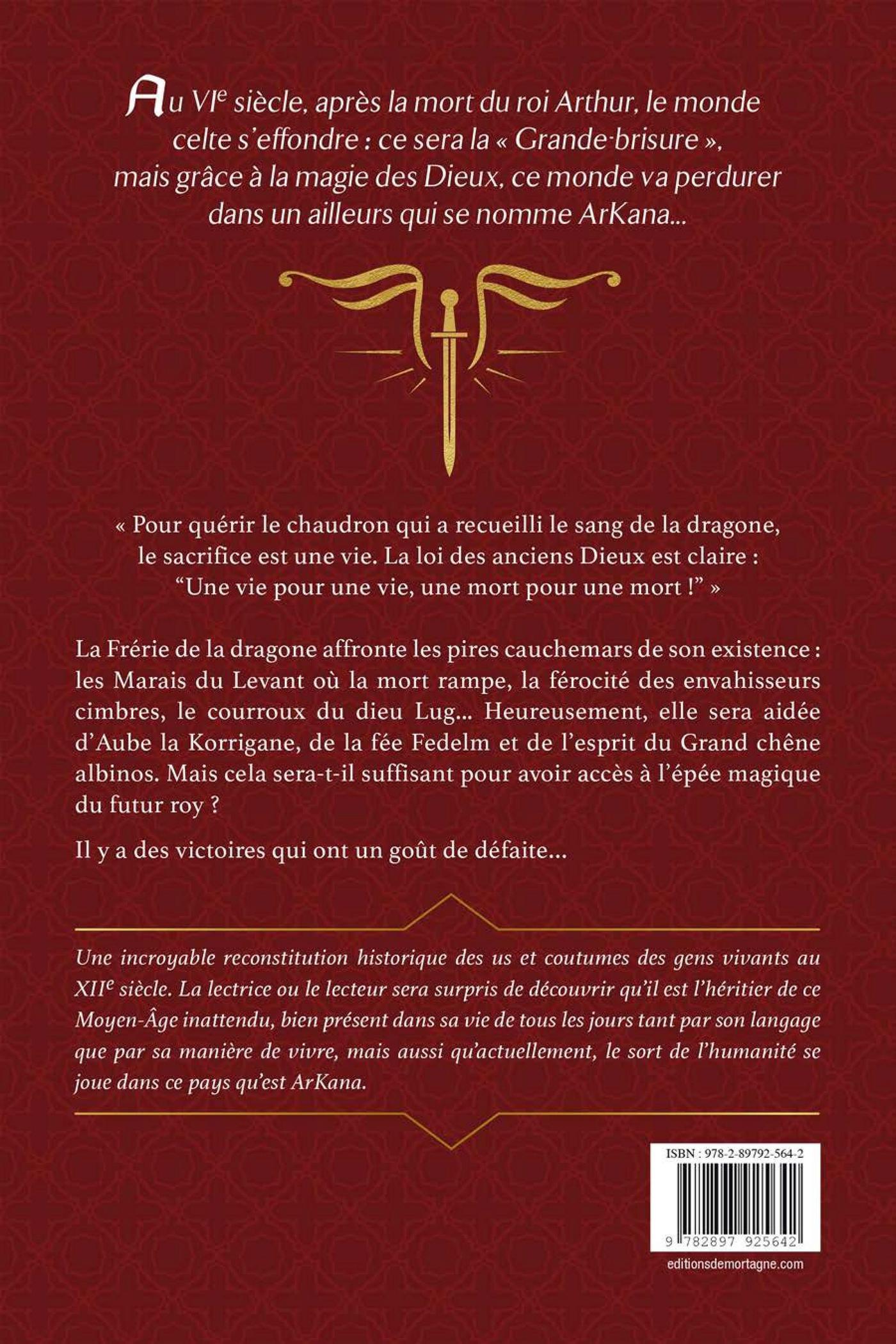 Au VIe siècle, après la mort du roi Arthur, le monde celte s’effondre : ce sera la « Grande-brisure », mais grâce à la magie des Dieux, ce monde va perdurer dans un ailleurs qui se nomme ArKana...« Pour quérir le chaudron qui a recueilli le sang de la dragone, le sacrifice est une vie. La loi des anciens Dieux est claire : “Une vie pour une vie, une mort pour une mort !” »La Frérie de la dragone affronte les pires cauchemars de son existence : les Marais du Levant où la mort rampe, la férocité des envahisseurs cimbres, le courroux du dieu Lug... Heureusement, elle sera aidée d’Aube la Korrigane, de la fée Fedelm et de l’esprit du Grand chêne albinos. Mais cela sera-t-il suffisant pour avoir accès à l’épée magique du futur roy ?Il y a des victoires qui ont un goût de défaite…Une incroyable reconstitution historique des us et coutumes des gens vivants au XIIe siècle. La lectrice ou le lecteur sera surpris de découvrir qu’il est l’héritier de ce Moyen-Âge inattendu, bien présent dans sa vie de tous les jours tant par son langage que par sa manière de vivre, mais aussi qu’actuellement, le sort de l’humanité se joue dans ce pays qu’est ArKana.