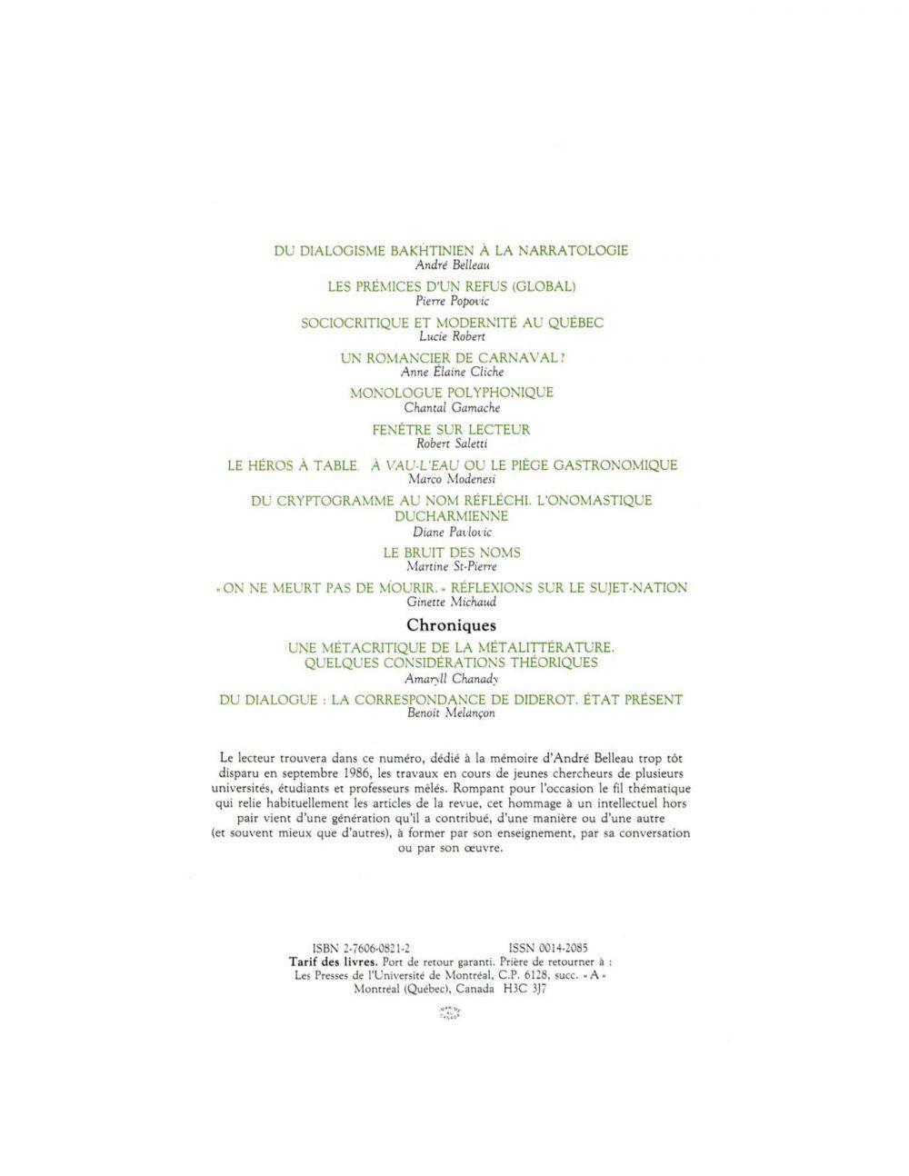 Benoît Melançon, Pierre Nepveu, Jonathan Weiss, Diane Pavlovic, Annie Brisset, Jean Cléo Godin, Lucie Robert