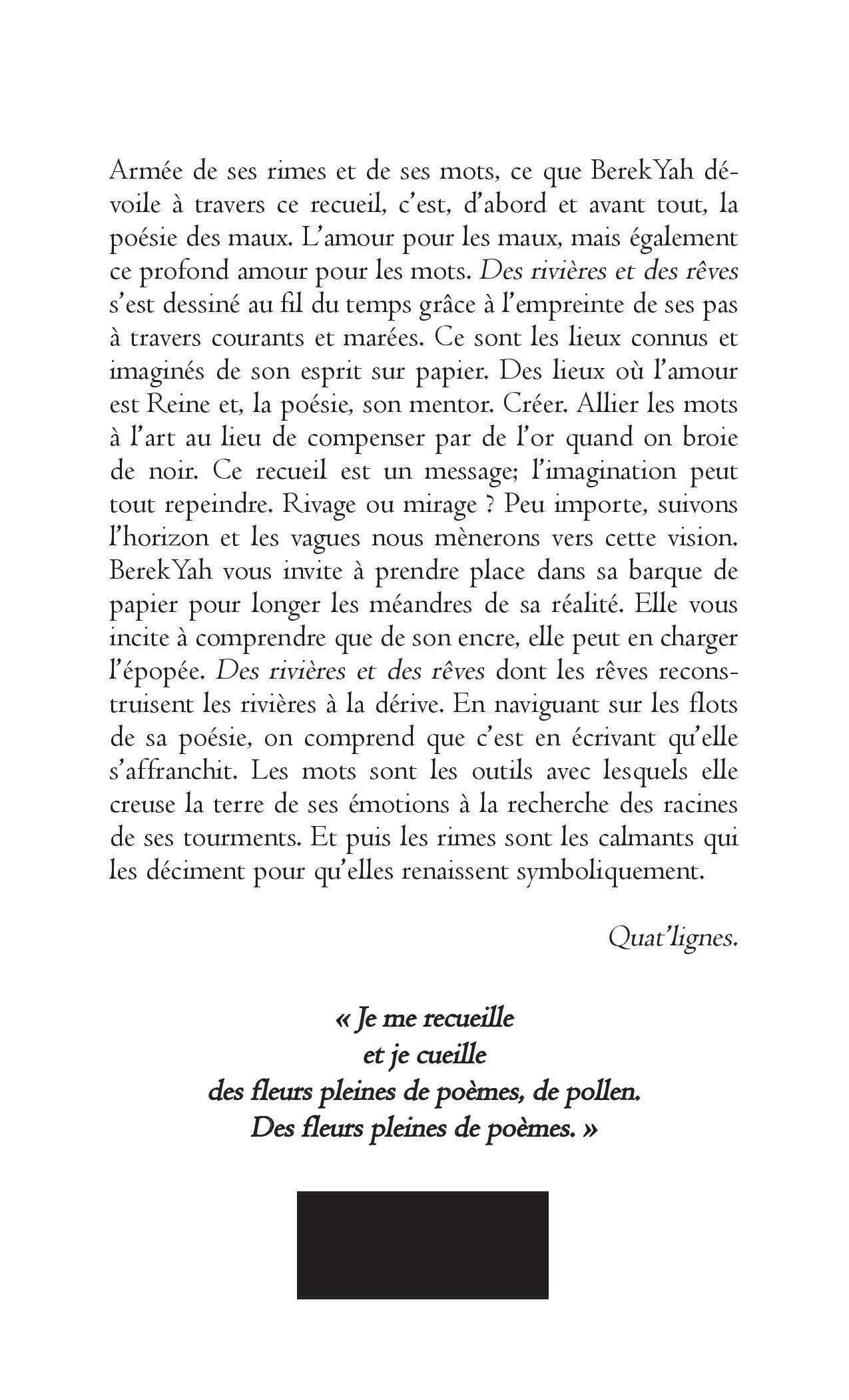 Première publication de la slameuse Berekyah: Des rivières et des rêves, un livre de poésie urbaine.Armée de ses rimes et de ses mots, ce que BerekYah dévoile à travers ce recueil, c’est, d’abord et avant tout, la poésie de ses maux. L’amour et ses maux, mais également ce profond amour pour les mots. Des rivières et des rêves s’est dessiné au fil du temps grâce à l’empreinte de ses pas à travers courants et marées. Ce sont les lieux connus et imaginés de son esprit sur papier. Des lieux où l’amour est Reine et la poésie, son mentor. Créer. Allier les mots à l’art au lieu de compenser par de l’or quand on broie du noir. Ce recueil est un message; l’imagination peut tout repeindre. Rivage ou mirage? Peu importe, suivons l’horizon et les vagues nous mèneront vers cette vision. BerekYah vous invite à prendre place dans sa barque de papier pour longer les méandres de sa réalité. Elle vous incite à comprendre que de son encre, elle peut en changer l’épopée. Des rivières et des rêves dont les rêves reconstruisent les rivières à la dérive. En naviguant sur les flots de sa poésie, on comprend que c’est en écrivant qu’elle s’affranchit. Les mots sont les outils avec lesquels elle creuse la terre de ses émotions à la recherche des racines de ses tourments. Et puis les rimes sont les calmants qui les déciment pour qu’elles renaissent symboliquement.