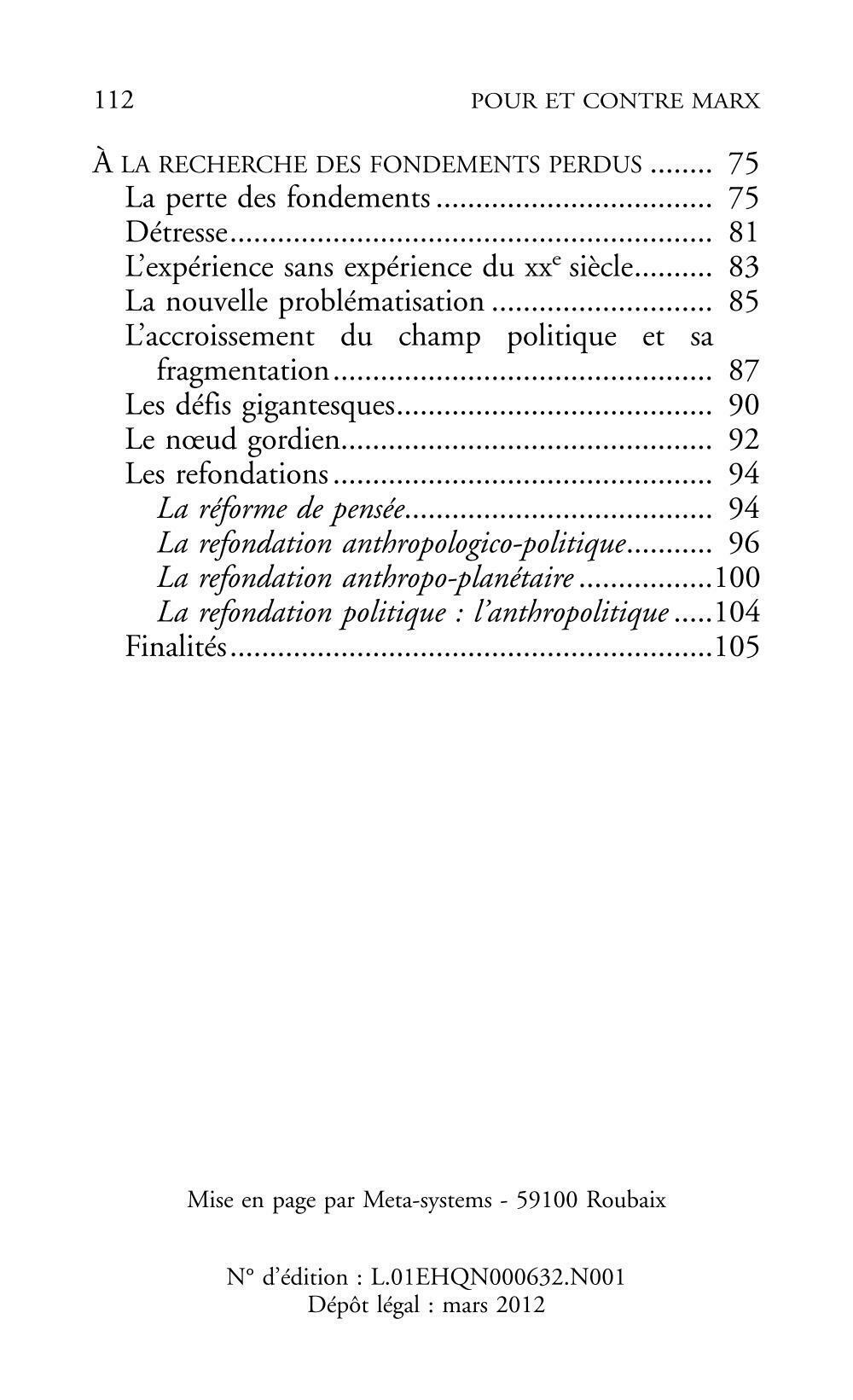 « Aujourd’hui, le problème n’est plus de savoir si la “doctrine” marxiste est morte ou non […] Marx doit être dépassé, c’est-à-dire intégré dans la constellation des penseurs qui peuvent éclairer notre réflexion. »À travers une série de textes limpides, Edgar Morin, qui dit avoir été marxien avant d’avoir été marxiste, revient sur ce penseur « titan » avec lequel il n’a jamais fini de penser et de dialoguer. Il donne à voir la fécondité de sa méthode – traquer les contradictions sociales et penser leur dépassement – pour l’appliquer à Marx lui-même, y reconnaître les limites et les impensés, et ouvrir la voie à un nouvel avenir.Alors que le libéralisme se déploie sur le monde et le plonge dans l’abîme écologique, politique, financier et éthique, Edgar Morin invite à retrouver Marx sous les décombres des marxismes, non pour en tirer des solutions miracles, mais pour penser le monde qui vient.En couverture : Edgar Morin © Ulf Andersen / Gamma. Karl Marx vers 1878 © Photo-Re-Pubblic / Leemage.