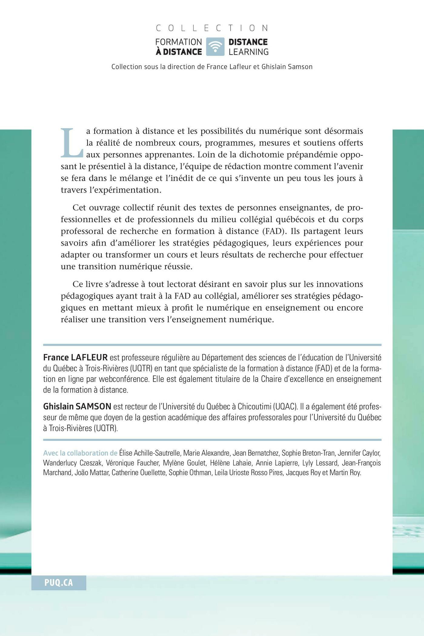 La formation à distance et les possibilités du numérique sont désormais la réalité de nombreux cours, programmes, mesures et soutiens offerts aux personnes apprenantes. Loin de la dichotomie prépandémie opposant le présentiel à la distance, l’équipe de rédaction montre comment l’avenir se fera dans le mélange et l’inédit de ce qui s’invente un peu tous les jours à travers l’expérimentation.Cet ouvrage collectif réunit des textes de personnes enseignantes, de professionnels et de professionnelles du milieu collégial québécois et du corps professoral de recherche en formation à distance (FAD). Ils partagent leurs savoirs afin d’améliorer les stratégies pédagogiques, leurs expériences pour adapter ou transformer un cours et leurs résultats de recherche pour effectuer une transition numérique réussie.Ce livre s’adresse à tout lectorat désirant réaliser une transition vers l’enseignement numérique, améliorer ses stratégies pédagogiques ou encore en savoir plus sur les innovations pédagogiques déployées au collégial à la FAD.France LAFLEUR est professeure régulière au Département des sciences de l'éducation de l'Université du Québec à Trois-Rivières (UQTR) en tant que spécialiste de la formation à distance (FAD) et de la formation en ligne par webconférence. Elle est également titulaire de la Chaire d'excellence en enseignement de la formation à distance.Ghislain SAMSON, anciennement professeur et doyen de la gestion académique des affaires professorales pour l'Université du Québec à Trois-Rivières (UQTR), est actuellement recteur de l'Université du Québec à Chicoutimi (UQAC).Avec la collaboration de Élise Achille-Sautrelle, Marie Alexandre, Jean Bernatchez, Sophie Breton-Tran, Jennifer Caylor, Wanderlucy Czeszak, Véronique Faucher, Mylène Goulet, Hélène Lahaie, Annie Lapierre, Lyly Lessard, Jean-François Marchand, João Mattar, Catherine Ouellette, Sophie Othman, Leila Urioste Rosso Pires, Jacques Roy et Martin Roy.