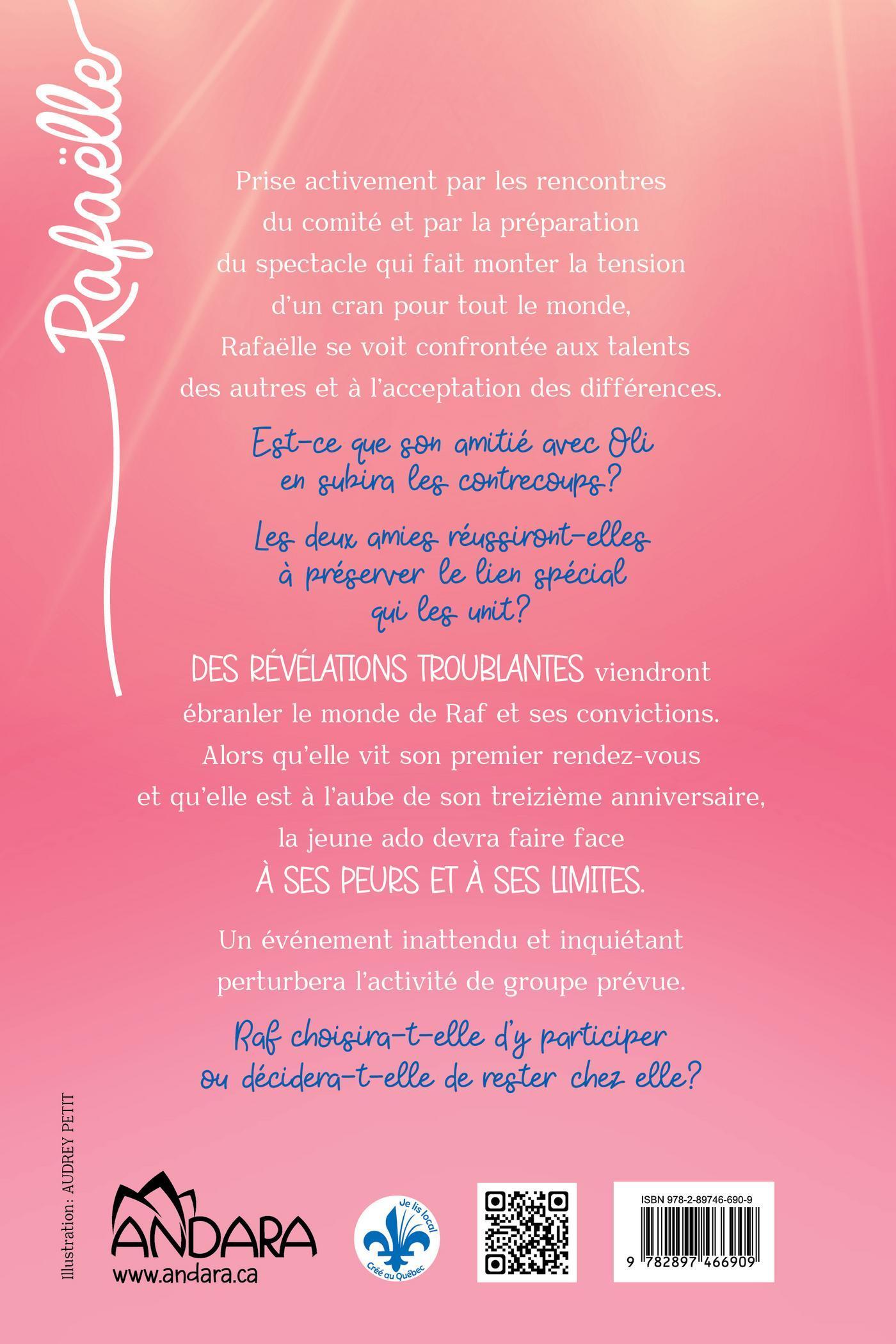 Prise activement par les rencontres du comité et par la préparation du spectacle qui fait monter la tension d’un cran pour tout le monde, Rafaëlle se voit confrontée aux talents des autres et à l’acceptation des différences. Est-ce que son amitié avec Oli en subira les contrecoups ? Les deux amies réussiront-elles à préserver le lien spécial qui les unit ? DES RÉVÉLATIONS TROUBLANTES viendront ébranler le monde de Raf et ses convictions. Alors qu’elle vit son premier rendez-vous et qu’elle est à l’aube de son treizième anniversaire, la jeune ado devra faire face À SES PEURS ET À SES LIMITES.