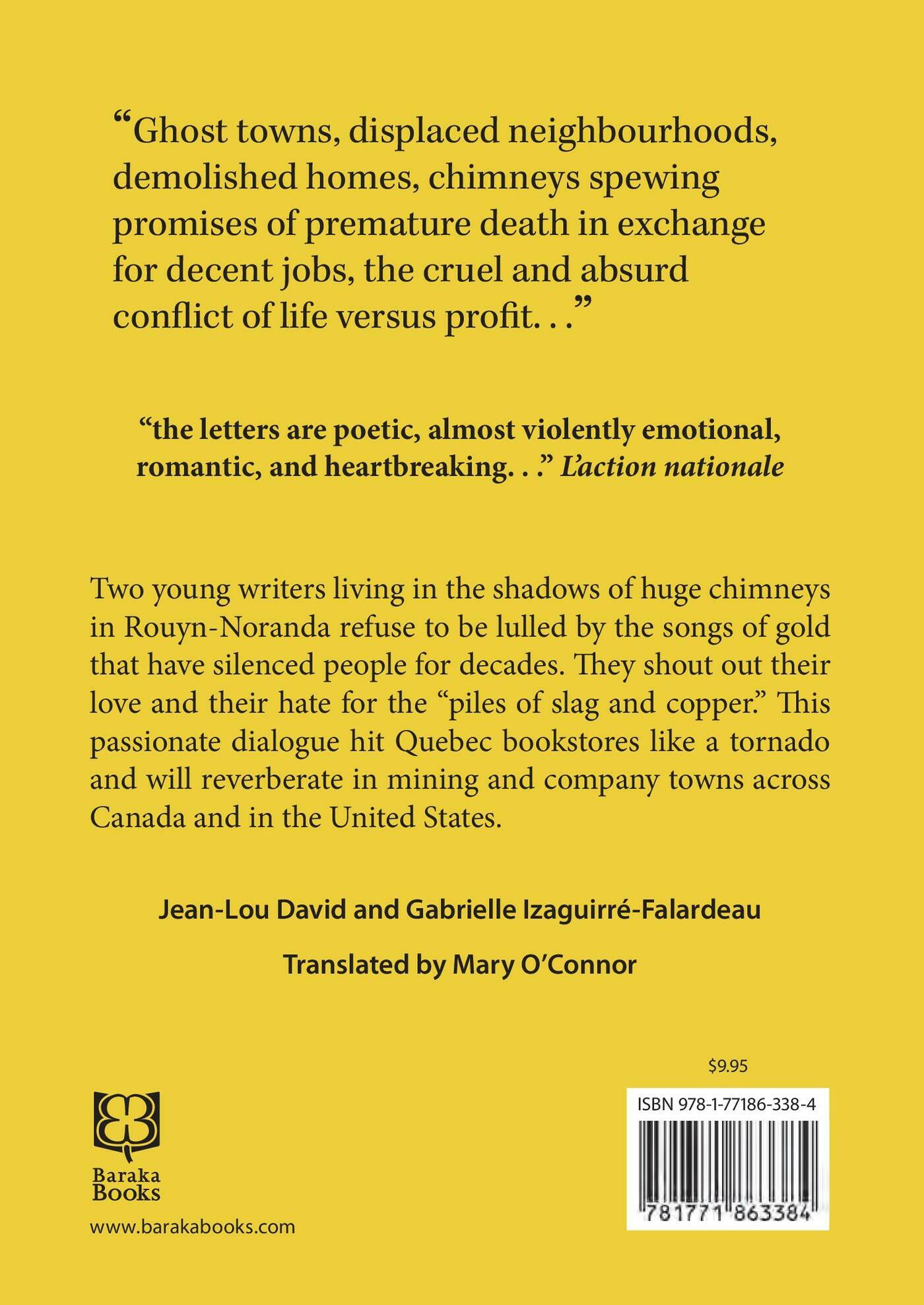 Two young writers who grew up in the shadow of the huge chimneys of a copper refinery in Rouyn-Noranda speak out. They refuse to be lulled by the songs of gold that have silenced the people who built the city and enriched the foundry owners for decades. They subtly and poetically illustrate the love-hate relationship they maintain with the arsenic and “piles of slag and copper.” This passionate dialogue in French hit Quebec bookstores like a tornado and the English version will echo in company towns throughout North America.Epigraph“These letters, peppered with love and rage, are another step in a movement that began long before our time, led by women and men who raised their voices against all odds. To the women who work without pay to demand justice for our community, to the citizens who have spoken out over the years, to those who have paid the price for their commitment, to honest doctors, may this book be used above all as a pretext for giving you a voice again and all the recognition that you deserve.”Jean-Lou David was born in Rouyn-Noranda in 1993. He is an author.Gabrielle Izaguirré-Falardeau grew up in Rouyn-Noranda. She is a student, artist and militant.Mary O’Connor is a Montreal translator who holds a degree from Trinity College, Dublin, Ireland.In the media“This unusual and often poetic dialogue between two writers about their love-hate relationship with the mining town of Rouyn-Noranda created a stir in Quebec, and is now translated into English. A passionate look at the realities of communities shadowed by smokestacks and the rapacious extraction of natural resources.” Quill and Quire“… the letters are poetic, almost violently emotional, romantic, and heartbreaking…” Pascal Chevrette, L’action nationale“The authors’ intimate and heartfelt approach inspires a profound reflection on how big industry exploits the territory but also a declaration of love for a region, its magnetic landscapes, its creative silence and places that recall the solidarity of the people.” Le Devoir