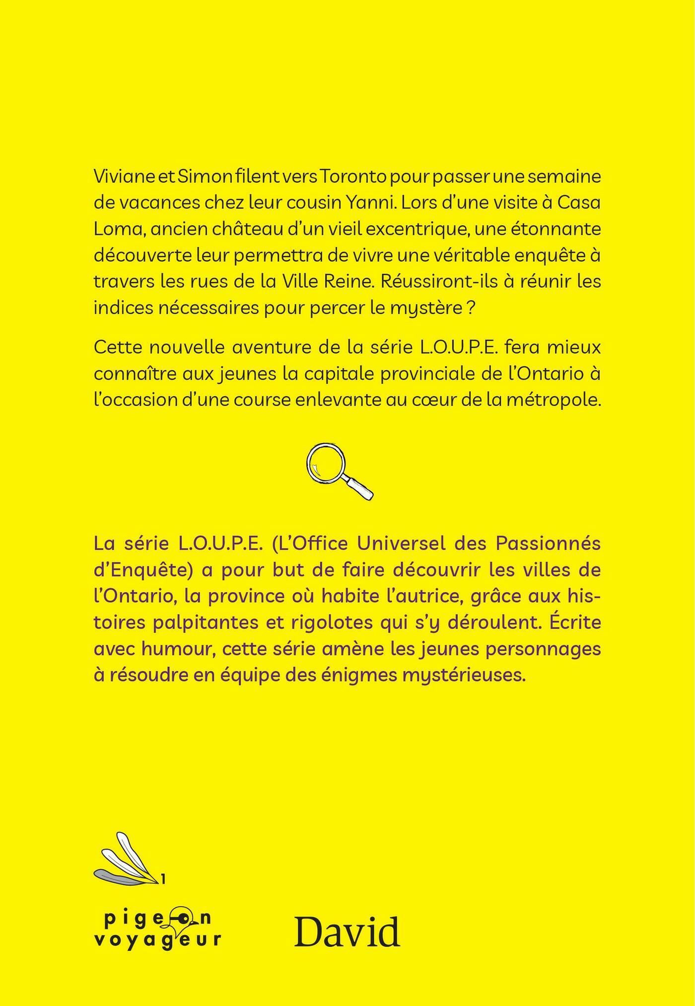 Viviane et Simon filent vers Toronto pour passer une semaine de vacances chez leur cousin Yanni. Lors d’une visite à Casa Loma, ancien château d’un vieil excentrique, une étonnante découverte leur permettra de vivre une véritable enquête à travers les rues de la Ville Reine. Réussiront-ils à réunir les indices nécessaires pour percer le mystère ?Cette nouvelle aventure de la série L.O.U.P.E. fera mieux connaître aux jeunes la capitale provinciale de l’Ontario à l’occasion d’une course enlevante au cœur de la métropole.La série L.O.U.P.E. (L’Office Universel des Passionnés d’Enquête) a pour but de faire découvrir les villes de l’Ontario, la province où habite l’autrice, grâce aux histoires palpitantes et rigolotes qui s’y déroulent. Écrite avec humour, cette série amène les jeunes personnages à résoudre en équipe des énigmes mystérieuses.