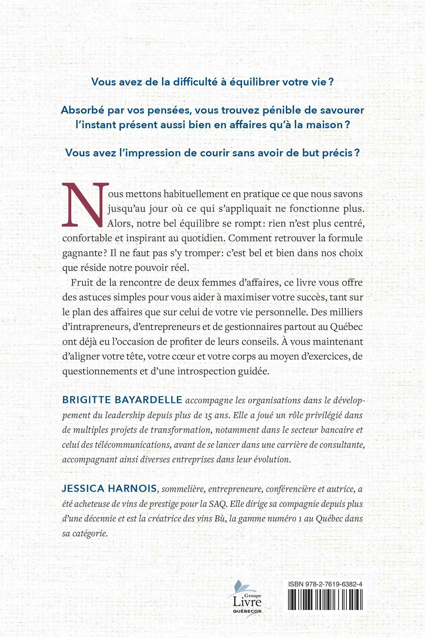 Fruit de la rencontre de deux femmes d'affaires, ce livre vous offre des astuces simples pour vous aider à maximiser votre succès, tant sur le plan des affaires que sur celui de votre vie personnelle. Des milliers d'intrapreneurs, d'entrepreneurs et de gestionnaires partout au Québec ont déjà eu l'occasion de profiter de leurs conseils. À vous maintenant d'aligner votre tête, votre cœur et votre corps au moyen d'exercices, de questionnements et d'une introspection guidée.