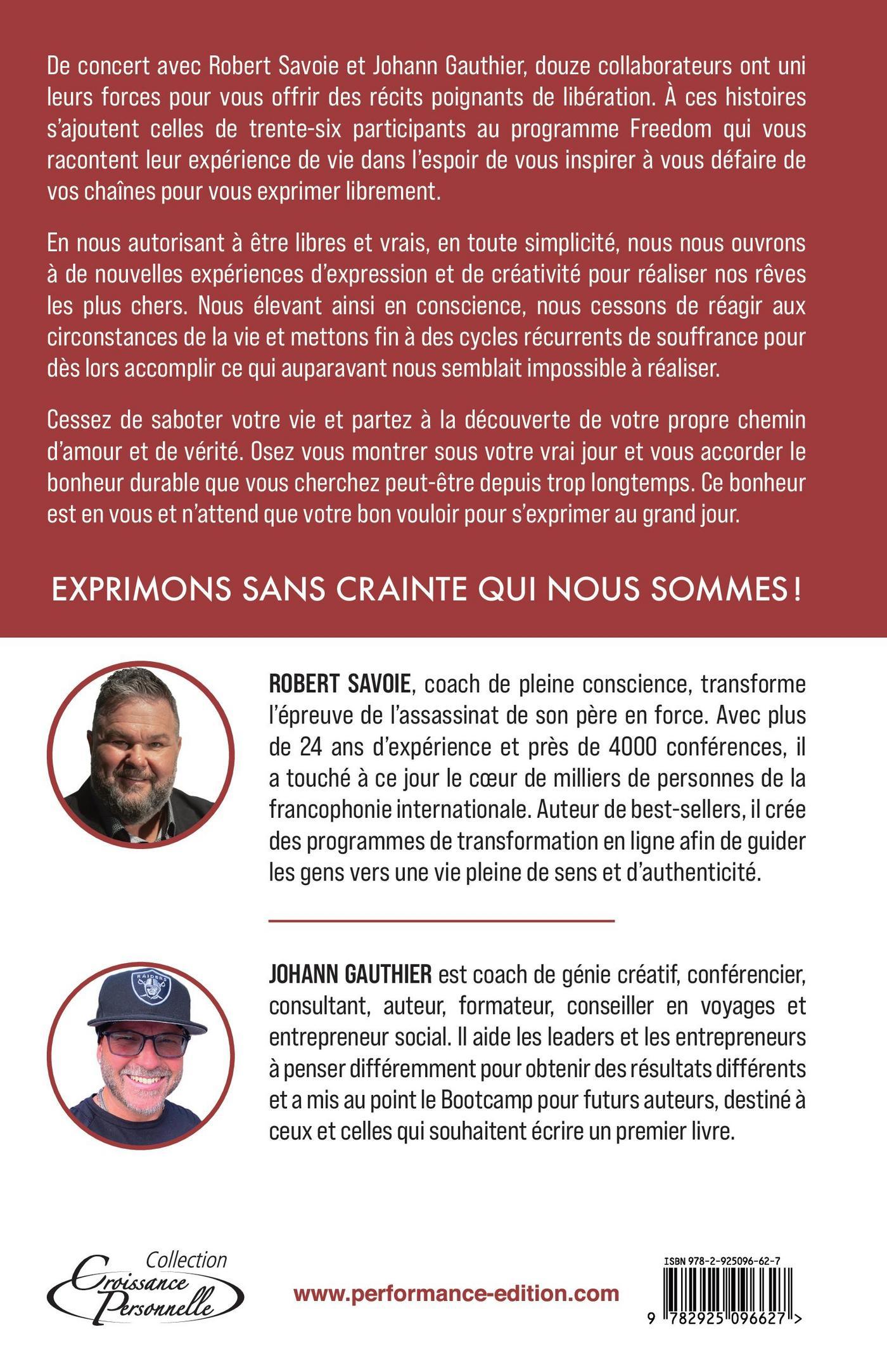 De concert avec Robert Savoie et Johann Gauthier, douze collaborateurs ont uni leurs forces pour vous offrir des récits poignants de libération. À ces histoires s’ajoutent celles de trente-six participants au programme Freedom qui vous racontent leur expérience de vie dans l’espoir de vous inspirer à vous défaire de vos chaînes pour vous exprimer librement.En nous autorisant à être libres et vrais, en toute simplicité, nous nous ouvrons à de nouvelles expériences d’expression et de créativité pour réaliser nos rêves les plus chers. Nous élevant ainsi en conscience, nous cessons de réagir aux circonstances de la vie et mettons fin à des cycles récurrents de souffrance pour dès lors accomplir ce qui auparavant nous semblait impossible à réaliser.Cessez de saboter votre vie et partez à la découverte de votre propre chemin d’amour et de vérité. Osez vous montrer sous votre vrai jour et vous accorder le bonheur durable que vous cherchez peut-être depuis trop longtemps. Ce bonheur est en vous et n’attend que votre bon vouloir pour s’exprimer au grand jour.