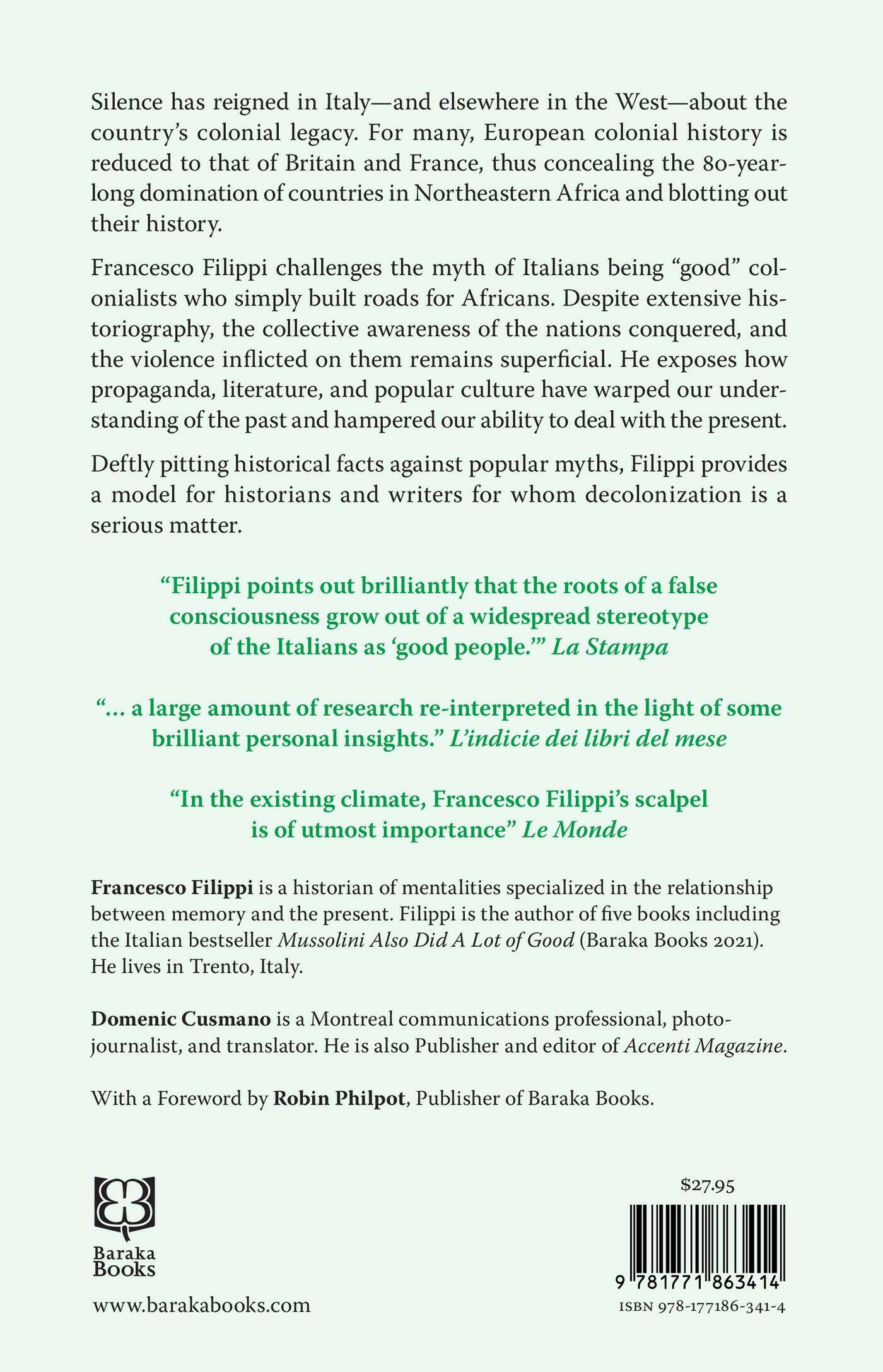 In the fiery political debates in and about Italy, silence reigns about the country’s colonial legacy. By reducing European colonial history to Britain and France, Italy has effectively concealed an enduring phenomenon in its history that lasted close to 80 years (1882 to 1960). It also blots out the history of the countries it colonized in Northeastern Africa.Italian colonial history began in 1882 with the acquisition of Assab Bay and came to a formal end only on July 1, 1960 when the Italian flag was lowered in Mogadishu, Somalia. It began well before Mussolini’s rise to power and lasted for many years thereafter. It involved both the Kingdom of Italy in the liberal period and the Republic of Italy after World War II.Francesco Filippi challenges the myth of Italians being “nice people” or “good” colonialists who simply built roads for Africans. Despite extensive historiography, the collective awareness of the nations conquered and the violence inflicted on them remains superficial, be it in Italy or internationally. He retraces Italy’s colonial history, focusing on how propaganda, literature and popular culture have warped our understanding of the past and thereby hampered our ability to deal with the present.As in his previous No. 1 Italian bestseller Mussolini Also Did A Lot of Good, Filippi pits historical facts against tenacious popular myths about Italy and Italy’s colonial history.With a Foreword by Robin Philpot, publisher of Baraka Books.The original Italian title is Noi però gli abbiamo fatto le strade, Le colonie italiane tra bugie, razzismi et amnesie. © 2021 Bollati Boringhieri editore, TorinoFrancesco Filippi is a historian of mentalities and an educator who has specialized in the relationship between memory and the present. He is co-founder of Deina, an association that organises trips of memory and training courses all over Italy. Filippi is the author of five books including the Italian bestseller Mussolini Also Did A Lot of Good (Baraka Books 2021). He lives in Trento, Italy.Domenic Cusmano is a Montreal communications professional, photojournalist, and translator whose previous translations include books from Italian and French into English. Publisher and editor of Accenti Magazine, he holds degrees from the Université de Montréal and McGill University. His work as a photojournalist has taken him throughout Europe, Africa, and South America.Reviews“Francesco Filippi returns to confront the history of mentality and with one of the most tragic and least known themes of Italy’s recent past. And he does it with his usual style at the same time documented and ironic, relying on a large amount of research re-interpreted in the light of some brilliant personal insights. In this way the author retraces the short parable of Italian colonialism.” L’indicie dei libri del mese“Filippi points out brilliantly that the roots of a false consciousness grow out of a widespread stereotype of the Italians as ‘good people.’ (…) his book warns us against ‘prejudice’ from believing we know when we don’t know…” Giovanni de Luna, La StampaAbout Mussolini Also Did A Lot of Good“We are indebted to Mr. Filippi for his skilled passion in establishing a proper analysis for those who seek to counter the supporters of Mussolini’s tyrannical reign.” Truby Chiaviello, Primo Magazine“Chapter by chapter, point by point, Filippi dislodges propaganda with fact, answers mirage with astringent sunlight, and dispels nostalgia with body-counts.” George Elliott Clarke“an antidote to all the nonsense still circulating about fascism…. Filippi is almost surgical in the way he reestablishes the context.” La Repubblica Book of the Month“In the existing climate, Francesco Filippi’s scalpel is of utmost importance” Le Monde“Francesco Filippi’s book is very timely and relevant … a lesson on a past that simply doesn’t go away.” Corriere Della SeraThis work has been translated with the contribution of the Centre for Books and Reading of the Italian Ministry of Culture.
