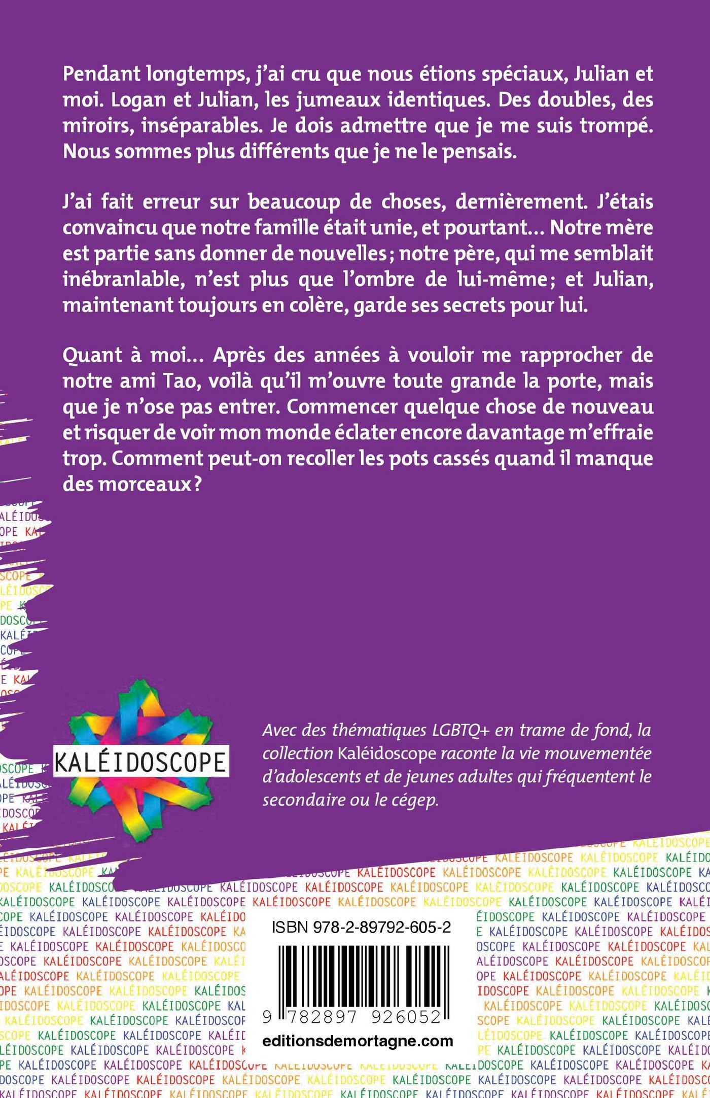 Pendant longtemps, j’ai cru que nous étions spéciaux, Julian et moi. Logan et Julian, les jumeaux identiques. Des doubles, des miroirs, inséparables. Je dois admettre que je me suis trompé. Nous sommes plus différents que je ne le pensais.J’ai fait erreur sur beaucoup de choses, dernièrement. J’étais convaincu que notre famille était unie, et pourtant... Notre mère est partie sans donner de nouvelles ; notre père, qui me semblait inébranlable, n’est plus que l’ombre de lui-même ; et Julian, maintenant toujours en colère, garde ses secrets pour lui.Quant à moi... Après des années à vouloir me rapprocher de notre ami Tao, voilà qu’il m’ouvre toute grande la porte, mais que je n’ose pas entrer. Commencer quelque chose de nouveau et risquer de voir mon monde éclater encore davantage m’effraie trop. Comment peut-on recoller les pots cassés quand il manque des morceaux ?