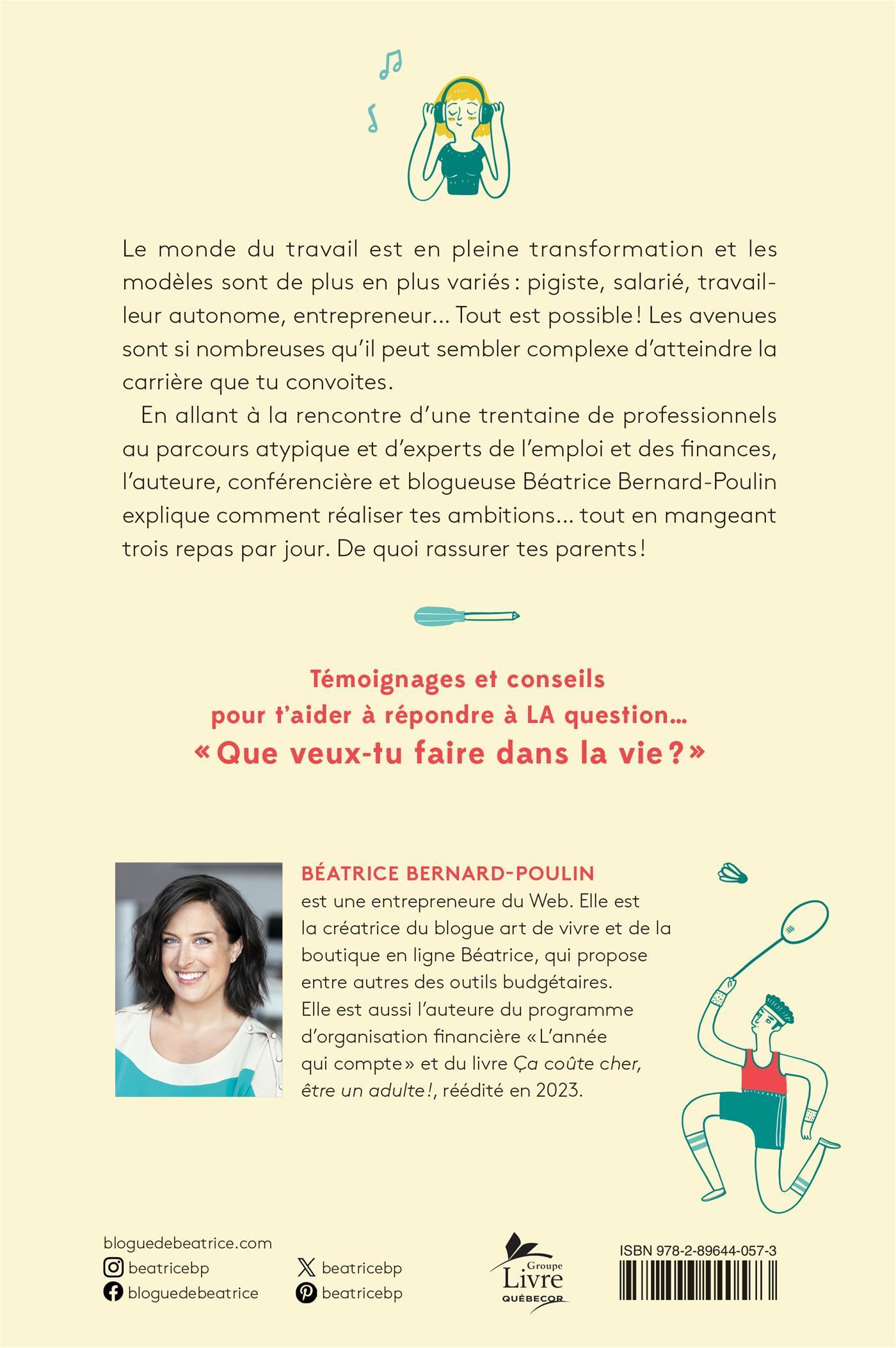 Le monde du travail est en pleine transformation et les modèles sont de plus en plus variés : pigiste, salarié, travailleur autonome, entrepreneur… Tout est possible ! Les avenues sont si nombreuses qu'il peut sembler complexe d'atteindre la carrière que tu convoites. En allant à la rencontre d'une trentaine de professionnels au parcours atypique et d'experts de l'emploi et des finances, l'auteure, conférencière et blogueuse Béatrice Bernard-Poulin explique comment réaliser tes ambitions… tout en mangeant trois repas par jour. De quoi rassurer tes parents !