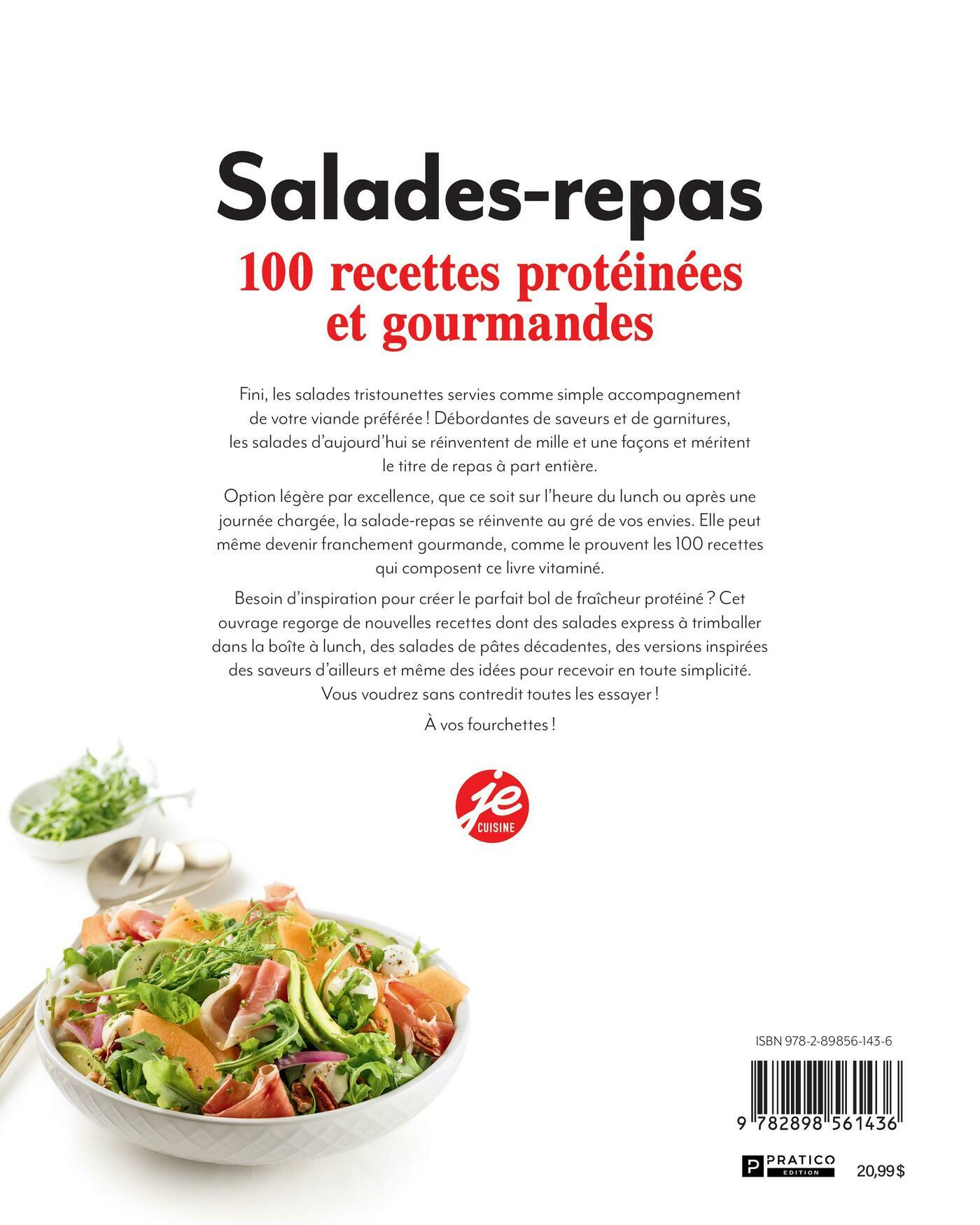 Fini, les salades tristounettes servies comme simple accompagnement de votre viande préférée ! Débordantes de saveurs et de garnitures, les salades d’aujourd’hui se réinventent de mille et une façons et méritent le titre de repas à part entière. Option légère par excellence, que ce soit sur l’heure du lunch ou après une journée chargée, la salade-repas se réinvente au gré de vos envies. Elle peut même devenir franchement gourmande, comme le prouvent les 100 recettes qui composent ce livre vitaminé.Besoin d’inspiration pour créer le parfait bol de fraîcheur protéiné ? Cet ouvrage regorge de nouvelles recettes dont des salades express à trimballer dans la boîte à lunch, des salades de pâtes décadentes, des versions inspirées des saveurs d’ailleurs et même des idées pour recevoir en toute simplicité. Vous voudrez sans contredit toutes les essayer !À vos fourchettes !