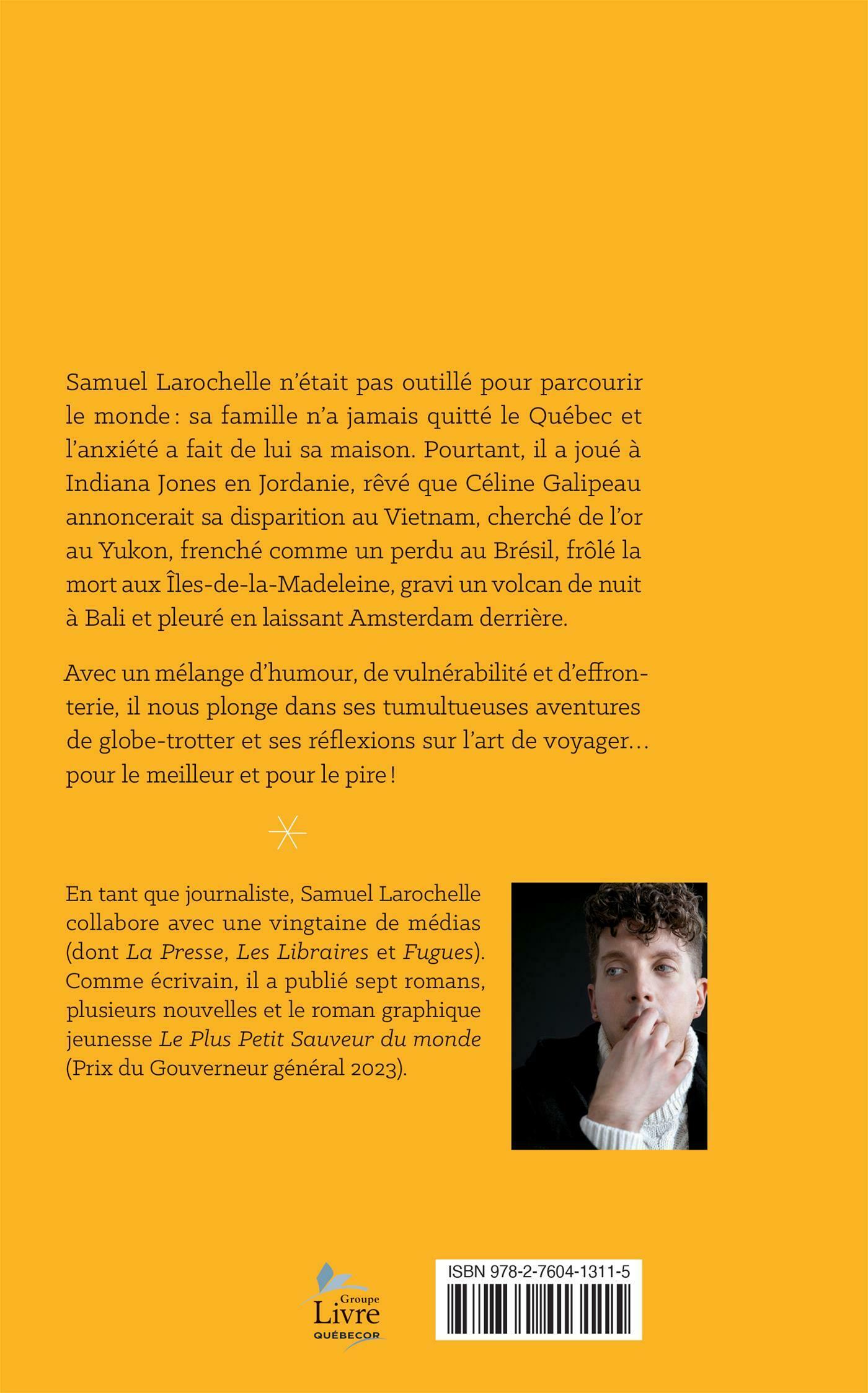 Samuel Larochelle n'était pas outillé pour parcourir le monde : sa famille n'a jamais quitté le Québec et l'anxiété a fait de lui sa maison. Pourtant, il a joué à Indiana Jones en Jordanie, rêvé que Céline Galipeau annoncerait sa disparition au Vietnam, cherché de l'or au Yukon, frenché comme un perdu au Brésil, frôlé la mort aux Îles-de-la-Madeleine, gravi un volcan de nuit à Bali et pleuré en laissant Amsterdam derrière.