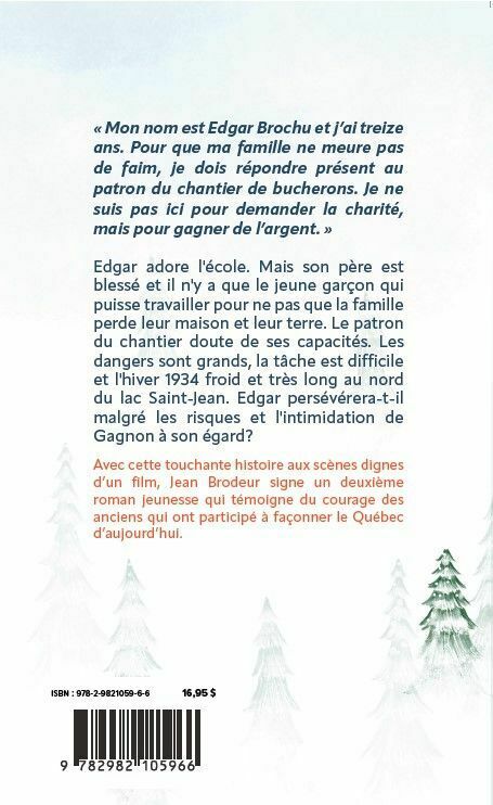 Edgar a 13 ans. Les premières années d’une ferme sont difficiles : il faut défricher avant de pouvoir semer et récolter pour se nourrir. Les colons au nord du lac Saint-Jean comme la famille d’Edgar en arrachent dans les années 1930. Heureusement, l’industrie du bois donne du travail aux hommes pendant les saisons où ils ne peuvent cultiver la terre. Mais Edgar est bien jeune pour remplacer son père sur le chantier. Pour cela, il doit quitter l'école qu'il aime. Entre le travail exigeant, le froid, le confort sommaire du camp, l’intimidation que le jeune garçon subit d’un dénommé Gagnon et ses inquiétudes pour le sort de sa famille en cette époque difficile de l’histoire du Québec et du monde, le jeune garçon devra puiser au fond de lui-même pour maintenir le cap, tisser des amitiés et sortir grandi de sa première saison « dans le bois ».