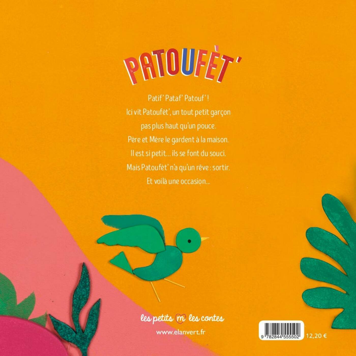 Patif’ Pataf’ Patouf’ ! Ici vit Patoufèt’, un tout petit garçon pas plus haut qu’un pouce. Père et Mère le gardent à la maison. Il est si petit… ils se font du souci. Mais Patoufèt’ n’a qu’un rêve : sortir. Et voilà une occasion…Enfin le minuscule Patoufèt’ peut sortir de la maison et aller faire les courses pour sa maman. Quelle joie ! Patoufèt’ réussit sa mission. Le lendemain et les jours suivants, Patoufèt’ rend service à ses parents. Un midi, il doit porter le repas à son papa qui est aux champs. Mais la vache le gobe ! Patoufèt’ a disparu, ses parents l’appellent le cherchent en vain. Quand soudain du ventre de la vache s’élève une petite voix : « Patim’, Patam’, Patoum’ ! Je sortirai quand la vache pétera ! » Prrrrrout ! Et revoici Patoufèt’ : hourra !