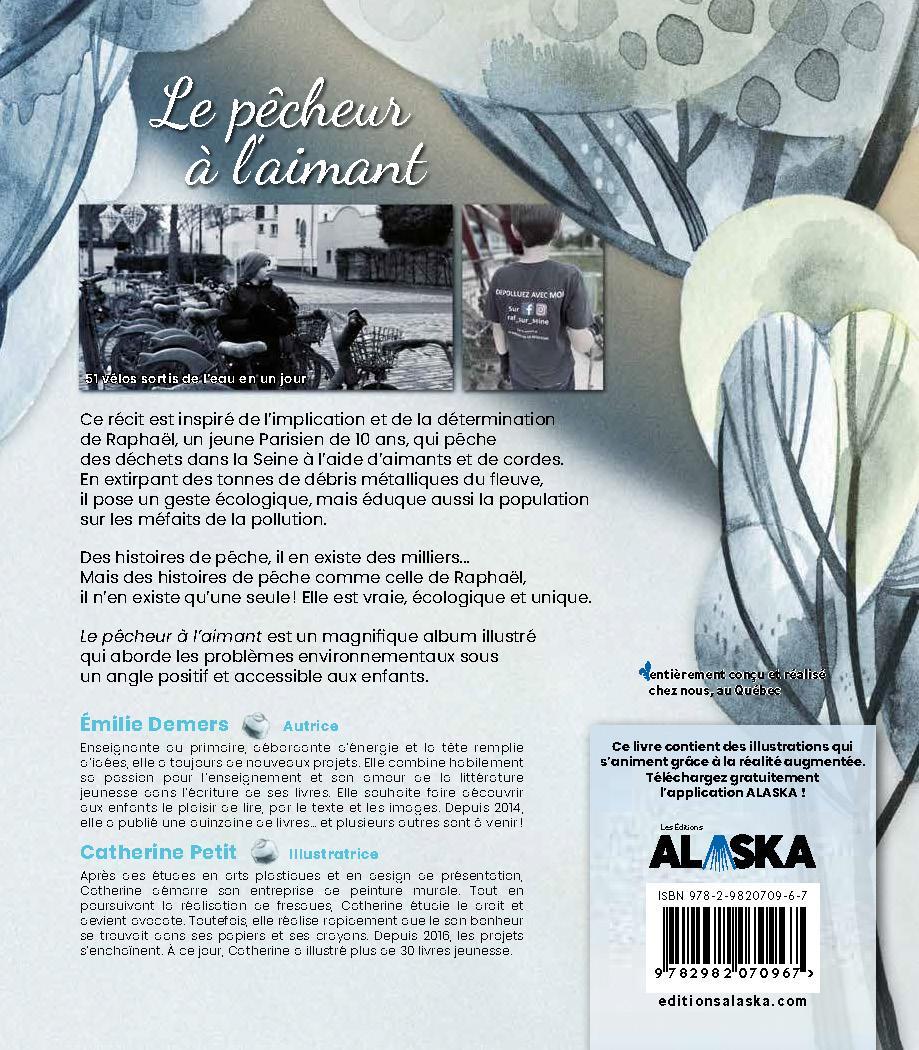 Ce récit est inspiré de l’implication et la détermination de Raphaël, un jeune Parisien de 10 ans, qui pêche des déchets dans la Seine à l’aide d’aimants et de cordes. En extirpant des tonnes de débris métalliques du fleuve, il pose un geste écologique, mais éduque aussi la population sur les méfaits de la pollution.Des histoires de pêche, il en existe des milliers... Mais des histoires de pêche comme celle de Raphaël, il n'en existe qu'une seule! Elle est vraie, écologique et unique.Le pêcheur à l’aimant est un magnifique album illustré qui aborde les problèmes environnementaux sous un angle positif et accessible aux enfants.Ce livre est une oeuvre interactive. Il contient des illustrations qui s'animent grâce à la réalité augmentée. Téléchargez gratuitement l'application ALASKA.