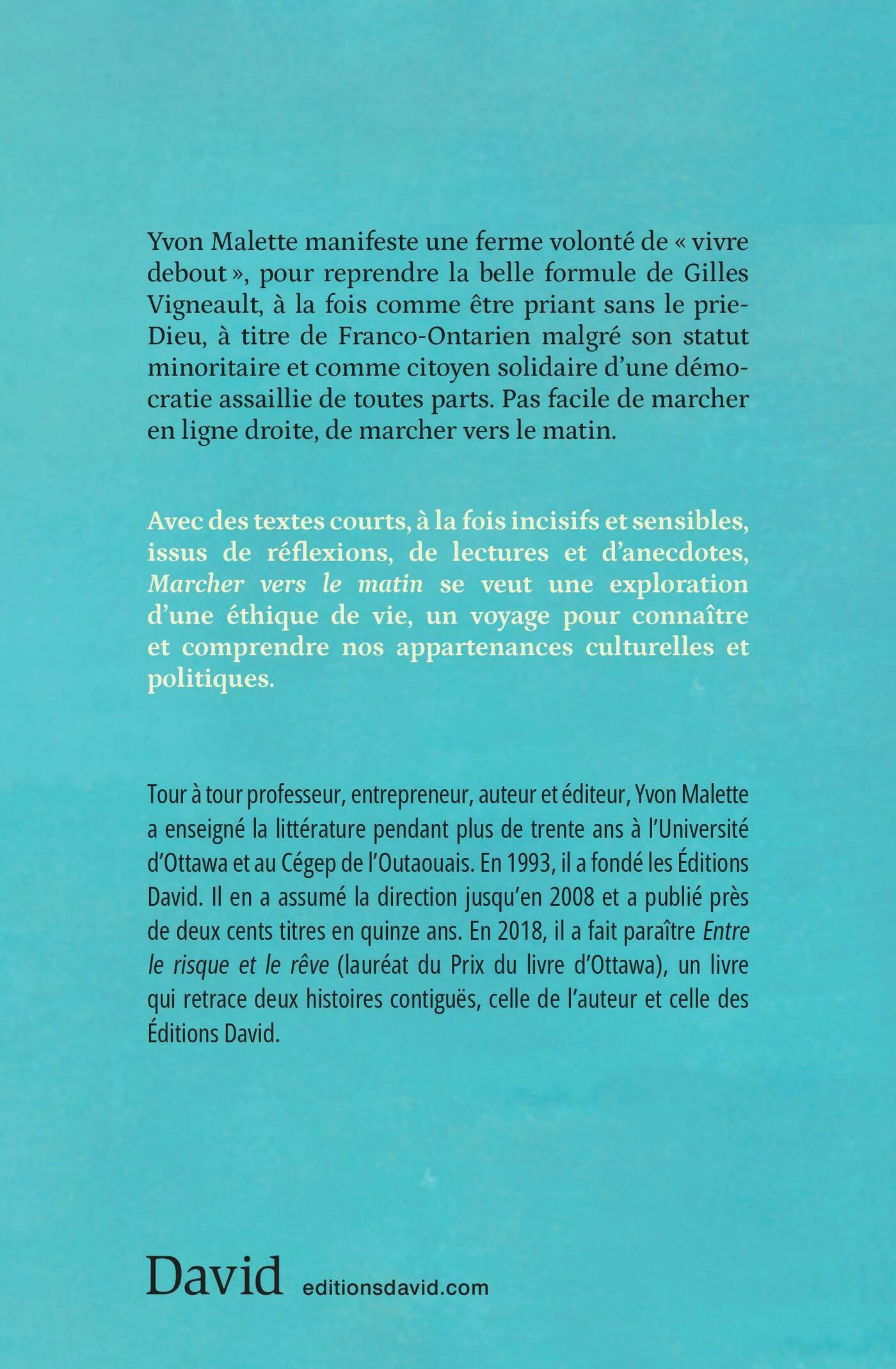 Yvon Malette manifeste une ferme volonté de « vivre debout », pour reprendre la belle formule de Gilles Vigneault, à la fois comme être priant sans le prie-Dieu, à titre de Franco-Ontarien malgré son statut minoritaire et comme citoyen solidaire d’une démocratie assaillie de toutes parts. Pas facile de marcher en ligne droite, de marcher vers le matin.Avec des textes courts, à la fois incisifs et sensibles, issus de réflexions, de lectures et d’anecdotes, Marcher vers le matin se veut une exploration d’une éthique de vie, un voyage pour connaître et comprendre nos appartenances culturelles et politiques.Tour à tour professeur, entrepreneur, auteur et éditeur, Yvon Malette a enseigné la littérature pendant plus de trente ans à l’Université d’Ottawa et au Cégep de l’Outaouais. En 1993, il a fondé les Éditions David. Il en a assumé la direction jusqu’en 2008 et a publié près de deux cents titres en quinze ans. En 2018, il a fait paraître Entre le risque et le rêve (lauréat du Prix du livre d’Ottawa), un livre qui retrace deux histoires contiguës, celle de l’auteur et celle des Éditions David.