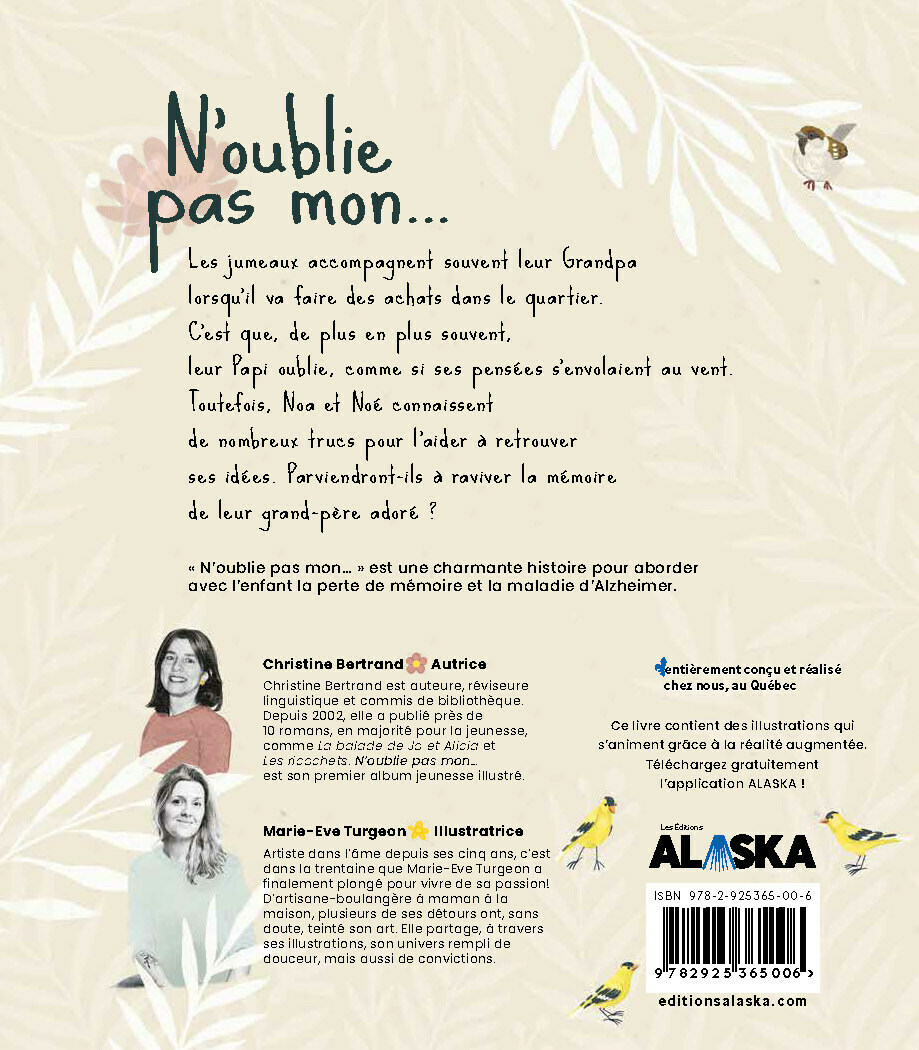 Les jumeaux accompagnent souvent leur GrandPa lorsqu'il s'agit d'aller faire des achats dans le quartier. C'est que de plus en plus souvent, leur Papi oublie, comme si ses pensées s’envolaient au vent. Toutefois, Noa et Noé connaissent de nombreux trucs pour l’aider à retrouver ses idées. Parviendront-ils à raviver la mémoire de leur grand-père adoré ? N’oublie pas mon… est une charmante histoire pour aborder avec l’enfant la perte de mémoire et la maladie d’Alzheimer. Ce livre est une oeuvre interactive. Il contient des illustrations qui s'animent grâce à la réalité augmentée. Téléchargez gratuitement l'application ALASKA.
