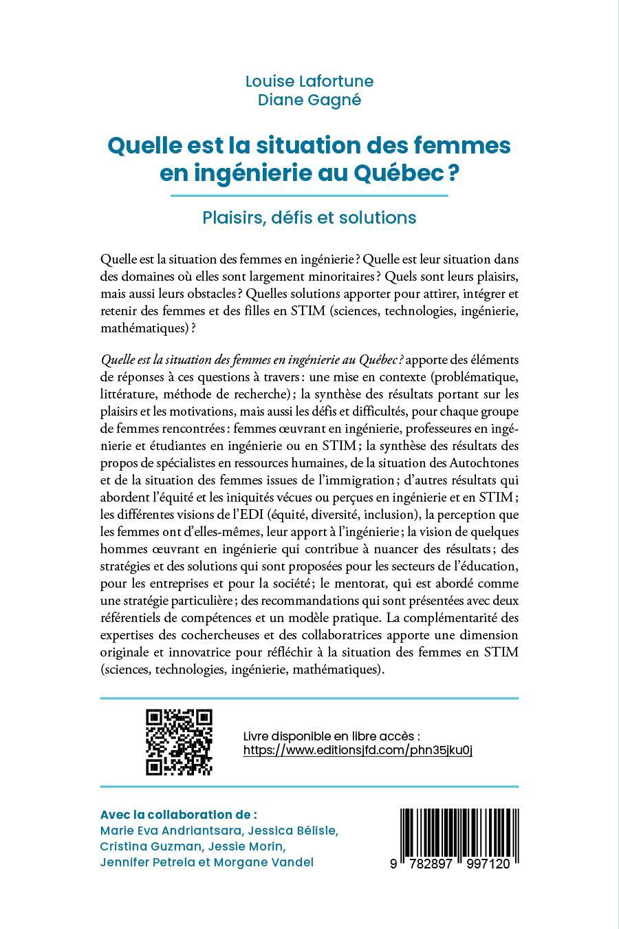 Quelle est la situation des femmes en ingénierie ? Quelle est leur situation dans des domaines où elles sont largement minoritaires ? Quels sont leurs plaisirs, mais aussi leurs obstacles ? Quelles solutions apporter pour attirer, intégrer et retenir des femmes et des filles en STIM (sciences, technologies, ingénierie, mathématiques) ?La situation de femmes en ingénierie au Québec : plaisirs, défis et solutions apporte des éléments de réponses à ces questions à travers : une mise en contexte (problématique, littérature, méthode de recherche) ; la synthèse des résultats portant sur les plaisirs et les motivations, mais aussi les défis et difficultés, pour chaque groupe de femmes rencontrées : femmes oeuvrant en ingénierie, professeures en ingénierie et étudiantes en ingénierie ou en STIM ; la synthèse des résultats des propos de spécialistes en ressources humaines, de la situation des Autochtones et de la situation des femmes issues de l’immigration ; d’autres résultats qui abordent l’équité et les iniquités vécues ou perçues en ingénierie et en STIM ; les différentes visions de l’EDI (équité, diversité, inclusion), la perception que les femmes ont d’elles-mêmes, leur apport à l’ingénierie ; la vision de quelques hommes oeuvrant en ingénierie qui contribue à nuancer des résultats ; des stratégies et des solutions qui sont proposées pour les secteurs de l’éducation, pour les entreprises et pour la société ; le mentorat, qui est abordé comme une stratégie particulière ; des recommandations qui sont présentées avec deux référentiels de compétences et un modèle pratique. La complémentarité des expertises des cochercheuses et des collaboratrices apporte une dimension originale et innovatrice pour réfléchir à la situation des femmes en STIM (sciences, technologies, ingénierie, mathématiques).Avec la collaboration de : Marie Eva Andriantsara, Jessica Bélisle, Cristina Guzman, Jessie Morin, Jennifer Petrela et Morgane Vandel