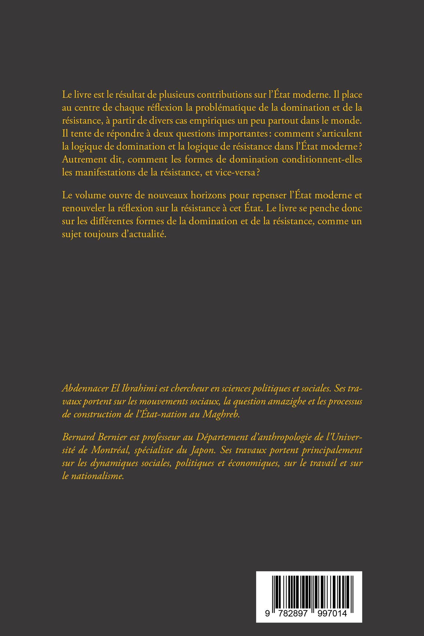 Le livre est le résultat de plusieurs contributions sur l’État moderne. Il place au centre de chaque réflexion la problématique de la domination et de la résistance, à partir de divers cas empiriques un peu partout dans le monde. Il tente de répondre à deux questions importantes : comment s’articulent la logique de domination et la logique de résistance dans l’État moderne ? Autrement dit, comment les formes de domination conditionnent-elles les manifestations de la résistance, et vice-versa ?Le volume ouvre de nouveaux horizons pour repenser l’État moderne et renouveler la réflexion sur la résistance à cet État. Le livre se penche donc sur les différentes formes de la domination et de la résistance, comme un sujet toujours d’actualité.