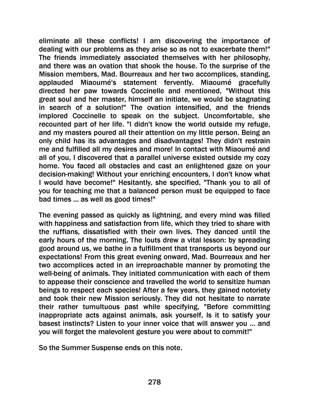 The Peace Mission completes several weeks of hard work against chaos and disharmony. More than one member of the Mission judges that he deserves a few weeks of vacation, including Miaoumé, who misses her familiar Hayloft. A member therefore wakes up at the makeshift camp, to find it almost abandoned. But step by step, Esteban finds his friends again. Then, the friends are attacked by strange robots that they must confront and understand. So everyone, humans, cats, and others, set out to solve the mystery of the robots, which leads them to reveal a terrible operation against the freedom and happiness of animals. During the fight, the SQ and the SPCA will be involved in the search for the cads responsible. Will good prevail?