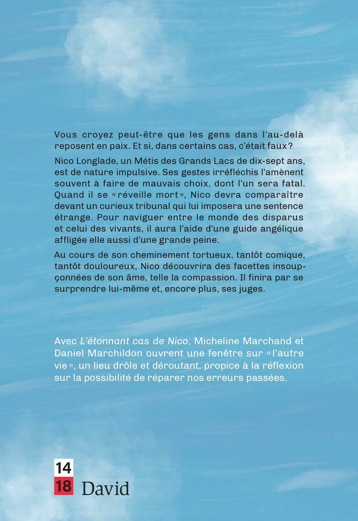 Vous croyez peut-être que les gens dans l’au-delà reposent en paix. Et si, dans certains cas, c’était faux ?Nico Longlade, un Métis des Grands Lacs de dix-sept ans, est de nature impulsive. Ses gestes irréfléchis l’amènent souvent à faire de mauvais choix, dont l’un sera fatal. Quand il se « réveille mort », Nico devra comparaître devant un curieux tribunal qui lui imposera une sentence étrange. Pour naviguer entre le monde des disparus et celui des vivants, il aura l’aide d’une guide angélique affligée elle aussi d’une grande peine.Au cours de son cheminement tortueux, tantôt comique, tantôt douloureux, Nico découvrira des facettes insoupçonnées de son âme, telle la compassion. Il finira par se surprendre lui-même et, encore plus, ses juges.Avec L’étonnant cas de Nico, Micheline Marchand et Daniel Marchildon ouvrent une fenêtre sur « l’autre vie », un lieu drôle et déroutant, propice à la réflexion sur la possibilité de réparer nos erreurs passées.