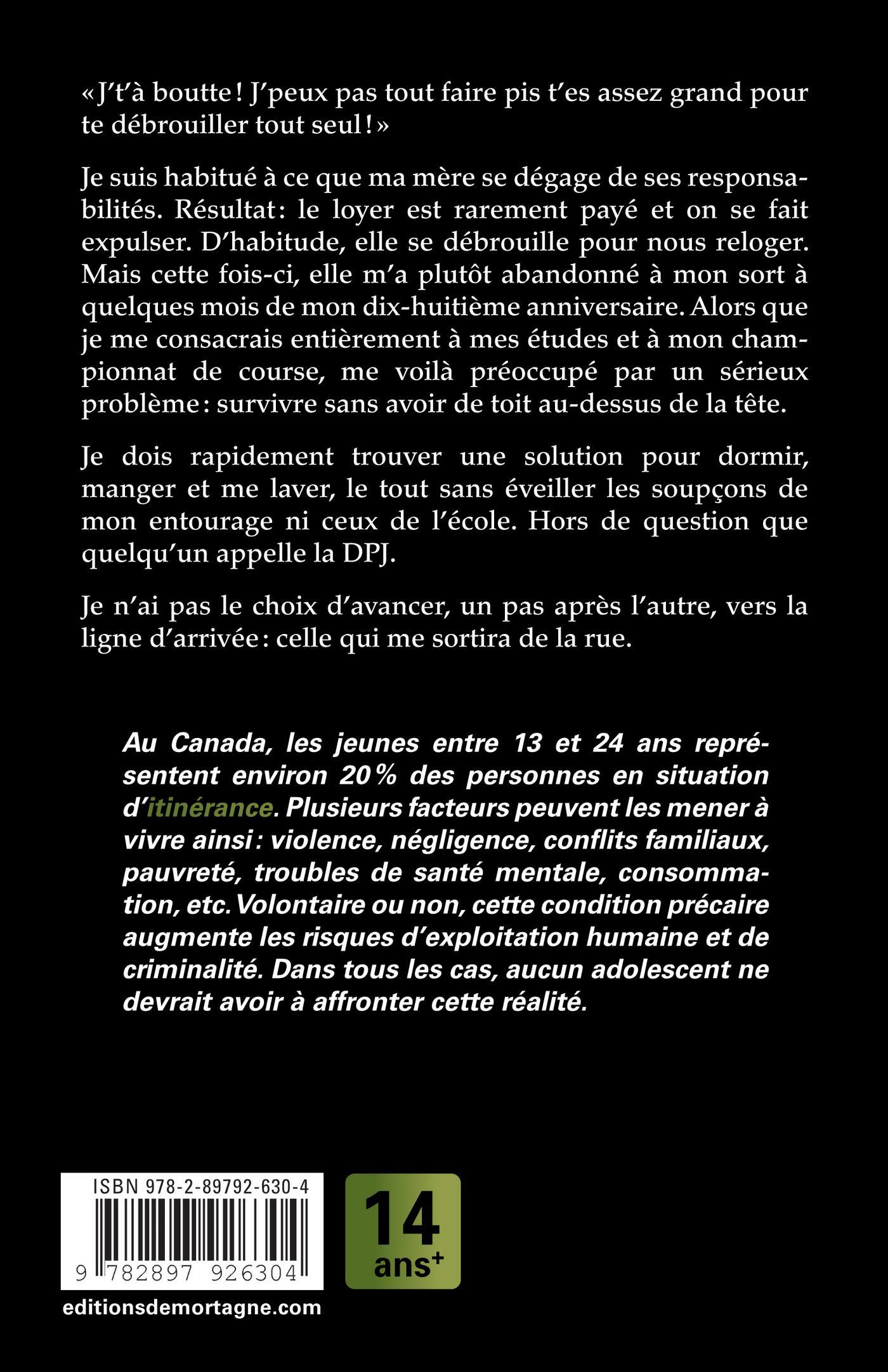 « J’t’à boutte ! J’peux pas tout faire pis t’es assez grand pour te débrouiller tout seul ! »Je suis habitué à ce que ma mère se dégage de ses responsabilités. Résultat : le loyer est rarement payé et on se fait expulser. D’habitude, elle se débrouille pour nous reloger.Mais cette fois-ci, elle m’a plutôt abandonné à mon sort à quelques mois de mon dix-huitième anniversaire. Alors que je me consacrais entièrement à mes études et à mon championnat de course, me voilà préoccupé par un sérieux problème : survivre sans avoir de toit au-dessus de la tête.Je dois rapidement trouver une solution pour dormir, manger et me laver, le tout sans éveiller les soupçons de mon entourage ni ceux de l’école. Hors de question que quelqu’un appelle la DPJ.Je n’ai pas le choix d’avancer, un pas après l’autre, vers la ligne d’arrivée : celle qui me sortira de la rue.Au Canada, les jeunes entre 13 et 24 ans représentent environ 20 % des personnes en situation d’itinérance. Plusieurs facteurs peuvent les mener à vivre ainsi : violence, négligence, conflits familiaux, pauvreté, troubles de santé mentale, consommation, etc. Volontaire ou non, cette condition précaire augmente les risques d’exploitation humaine et de criminalité. Dans tous les cas, aucun adolescent ne devrait avoir à affronter cette réalité.