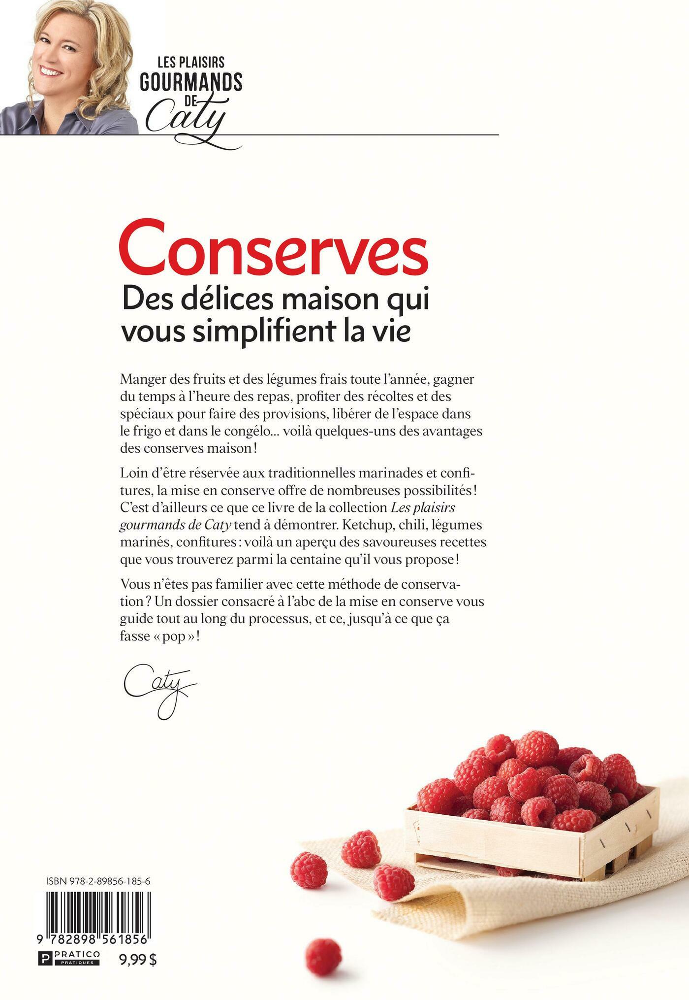 Manger des fruits et des légumes frais toute l’année, gagner du temps à l’heure des repas, profi ter des récoltes et des spéciaux pour faire des provisions, libérer de l’espace dans le frigo et dans le congélo… voilà quelques-uns des avantages des conserves maison ! Loin d’être réservée aux traditionnelles marinades et confitures, la mise en conserve offre de nombreuses possibilités !C’est d’ailleurs ce que ce livre de la collection Les plaisirs gourmands de Caty tend à démontrer. Ketchup, chili, légumes marinés, confitures : voilà un aperçu des savoureuses recettes que vous trouverez parmi la centaine qu’il vous propose ! Vous n’êtes pas familier avec cette méthode de conservation ? Un dossier consacré à l’abc de la mise en conserve vous guide tout au long du processus, et ce, jusqu’à ce que ça fasse « pop » !