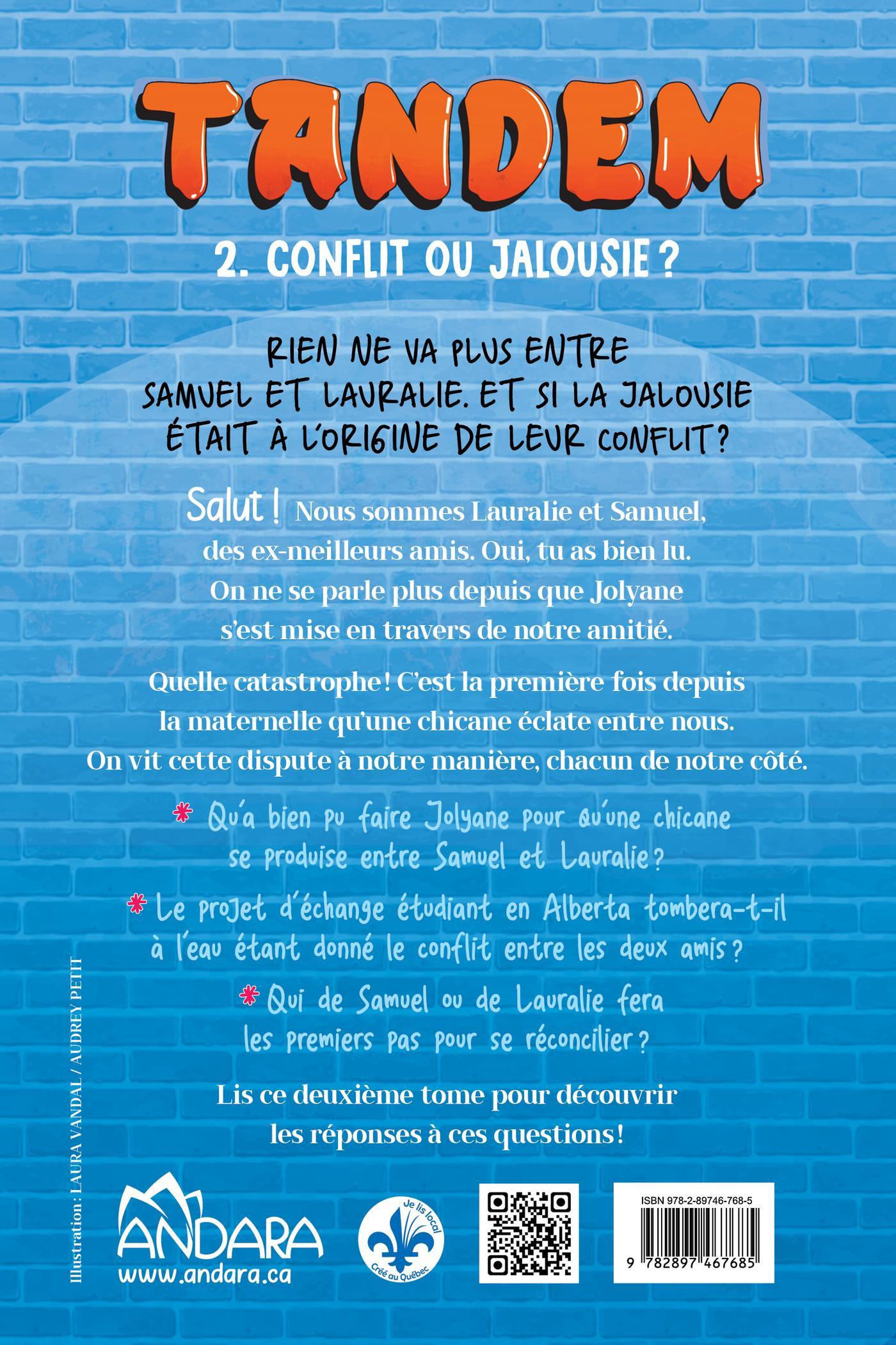 RIEN NE VA PLUS ENTRE SAMUEL ET LAURALIE. ET SI LA JALOUSIE ÉTAIT À L’ORIGINE DE LEUR CONFLIT ? Salut ! Nous sommes Lauralie et Samuel, des ex-meilleurs amis. Oui, tu as bien lu. On ne se parle plus depuis que Jolyane s’est mise en travers de notre amitié. Quelle catastrophe ! C’est la première fois depuis la maternelle qu’une chicane éclate entre nous. On vit cette dispute à notre manière, chacun de notre côté. Qu’a bien pu faire Jolyane pour qu’une chicane se produise entre Samuel et Lauralie ? Le projet d’échange étudiant en Alberta tombera-t-il à l’eau étant donné le conflit entre les deux amis ? Qui de Samuel ou de Lauralie fera les premiers pas pour se réconcilier ? Lis ce deuxième tome pour découvrir les réponses à ces questions !