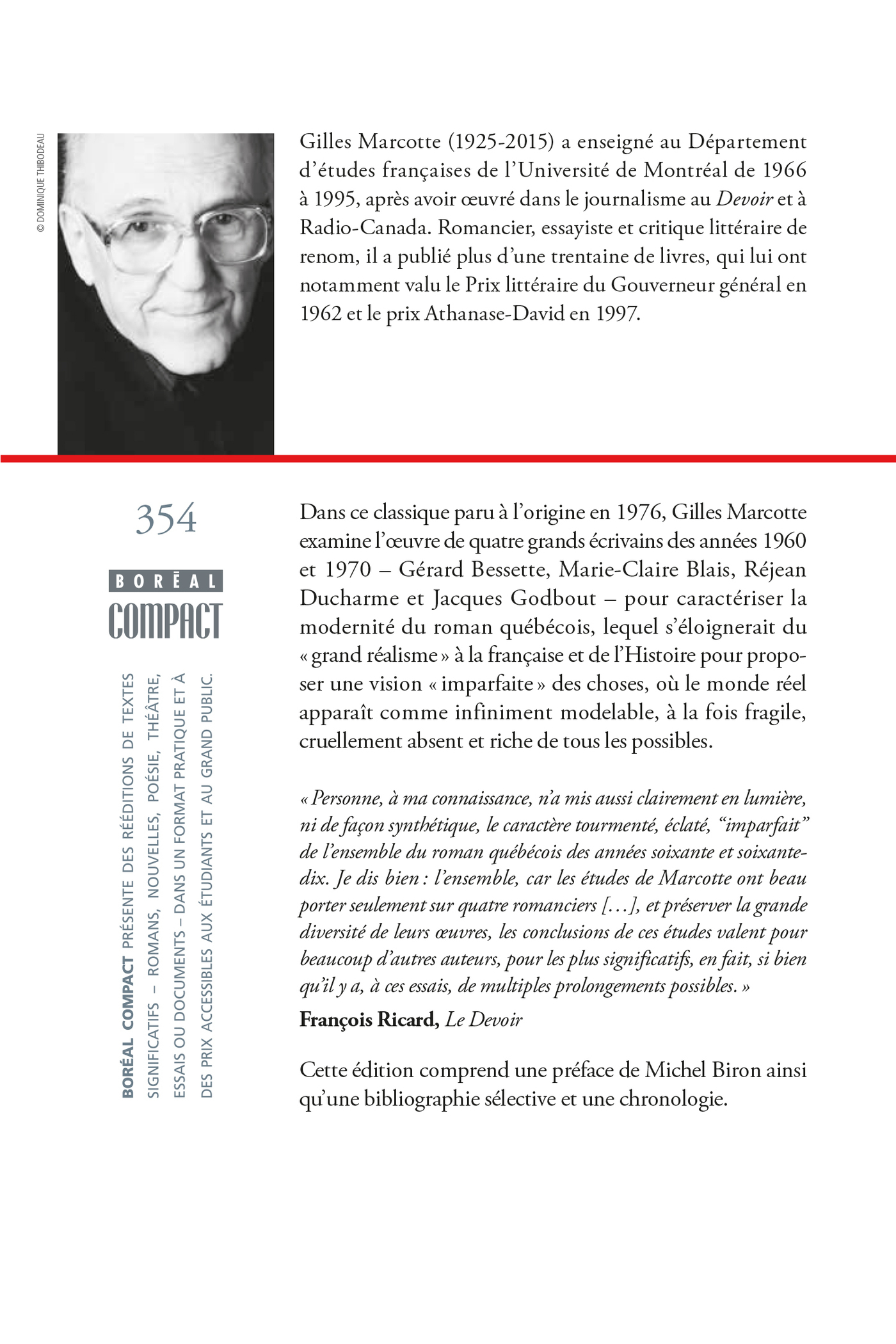 Dans cet essai incontournable qui lui a valu le Grand Prix du livre de la Ville de Montréal en 1977, Gilles Marcotte examine l’œuvre de quatre grands écrivains des années 1960 – Gérard Bessette, Marie-Claire Blais, Réjean Ducharme et Jacques Godbout – pour caractériser la modernité du roman québécois, lequel s’éloignerait du « grand réalisme » à la française et de l’Histoire pour explorer les aléas du quotidien et les possibilités du langage. En rendant compte de la spécificité du roman d’ici et de son avènement comme genre littéraire dominant, Le Roman à l’imparfait a ouvert la voie à tout un pan de la critique littéraire contemporaine.