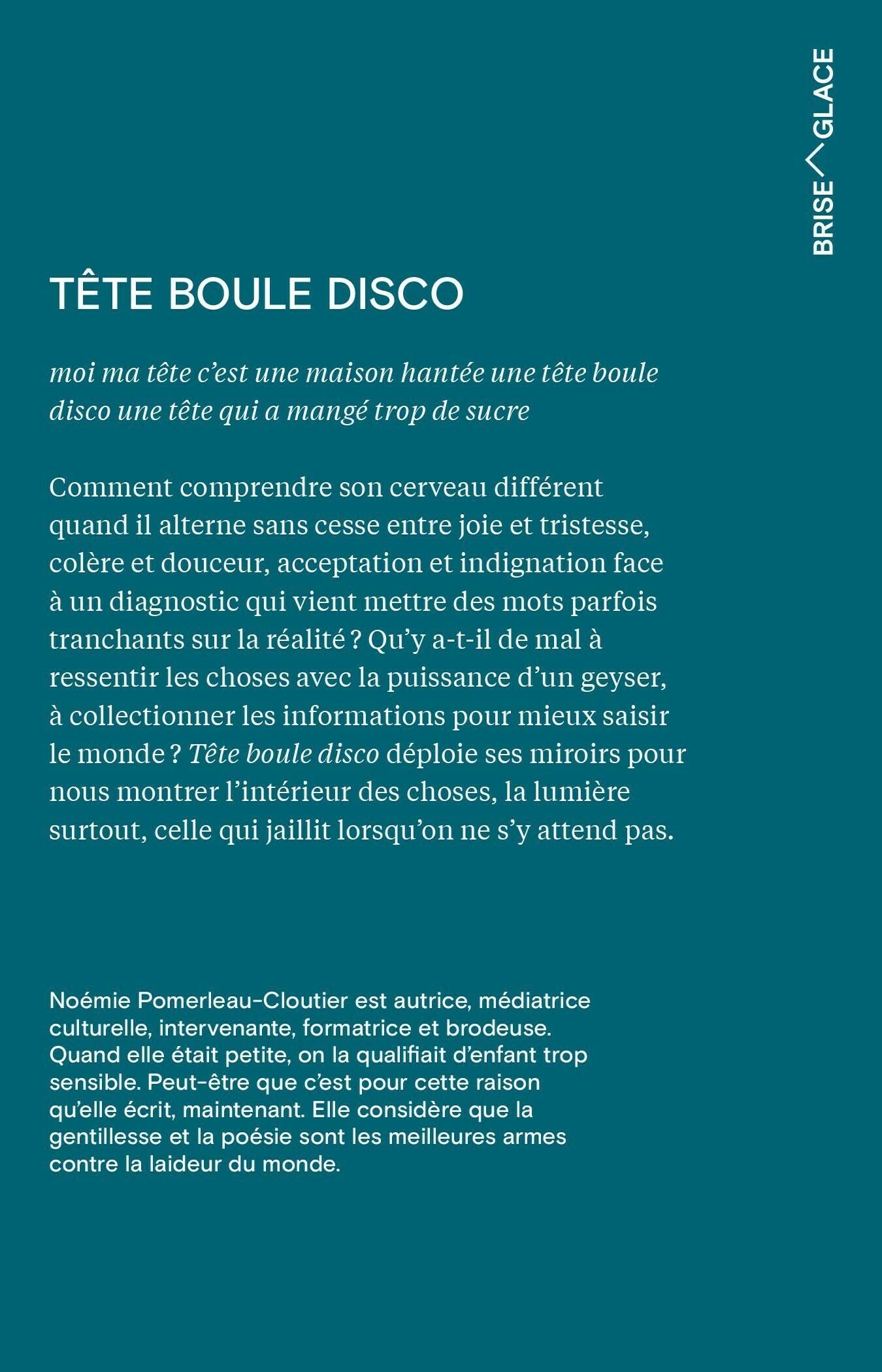 Noémie Pomerleau-Cloutier signe ici une première œuvre pour la jeunesse dans laquelle elle effectue une plongée tout en douceur et en sensibilité dans un cerveau atypique et flamboyant. Alternant entre joie et tristesse, entre colère et douceur, entre acceptation et indignation face à un diagnostic qui vient mettre des mots parfois tranchants sur la réalité, le protagoniste de Tête boule disco traverse la vie à sa manière, sans s’excuser.