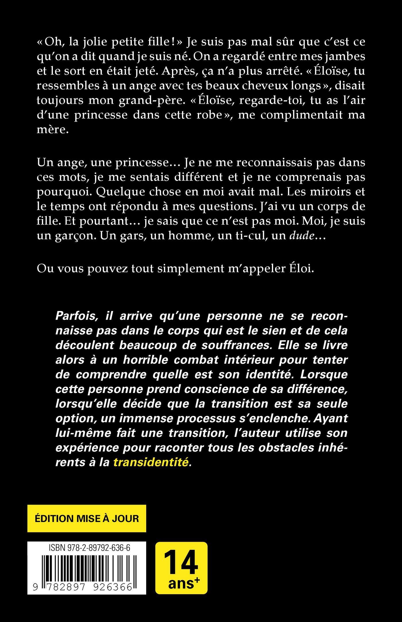 « Oh, la jolie petite fille ! » Je suis pas mal sûr que c’est ce qu’on a dit quand je suis né. On a regardé entre mes jambes et le sort en était jeté. Après, ça n’a plus arrêté. « Éloïse, tu ressembles à un ange avec tes beaux cheveux longs », disait toujours mon grand-père. « Éloïse, regarde-toi, tu as l’air d’une princesse dans cette robe », me complimentait ma mère.Un ange, une princesse… Je ne me reconnaissais pas dans ces mots, je me sentais différent et je ne comprenais pas pourquoi. Quelque chose en moi avait mal. Les miroirs et le temps ont répondu à mes questions. J’ai vu un corps de fille. Et pourtant… je sais que ce n’est pas moi. Moi, je suis un garçon. Un gars, un homme, un ti-cul, un dude…Ou vous pouvez tout simplement m’appeler Éloi.Parfois, il arrive qu’une personne ne se reconnaisse pas dans le corps qui est le sien et de cela découlent beaucoup de souffrances. Elle se livre alors à un horrible combat intérieur pour tenter de comprendre quelle est son identité. Lorsque cette personne prend conscience de sa différence, lorsqu’elle décide que la transition est sa seule option, un immense processus s’enclenche. Ayant lui-même fait une transition, l’auteur utilise son expérience pour raconter tous les obstacles inhérents à la transidentité.