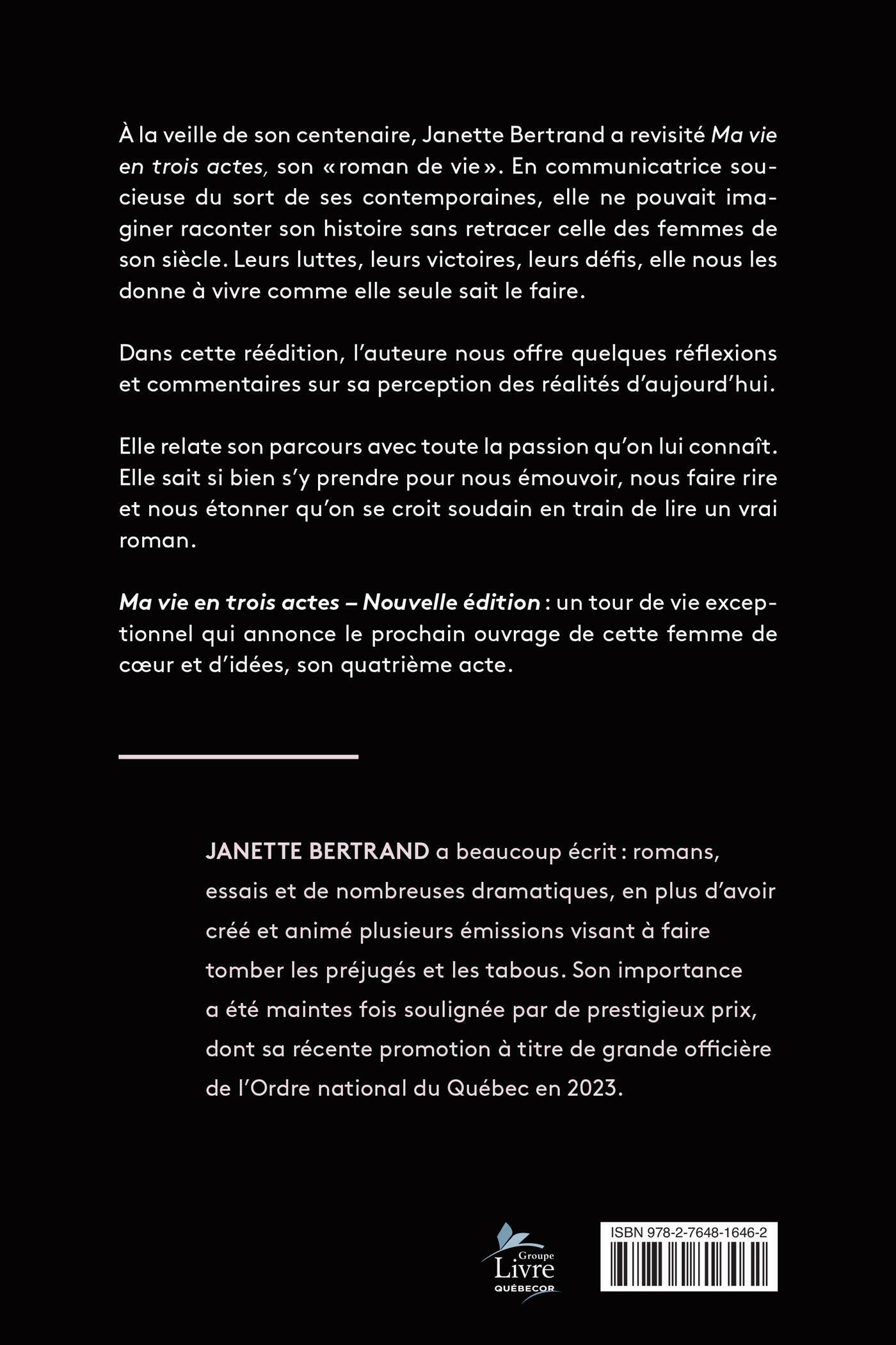 À la veille de son centenaire, Janette Bertrand a revisité Ma vie en trois actes, son « roman de vie ». En communicatrice soucieuse du sort de ses contemporaines, elle ne pouvait imaginer raconter son histoire sans retracer celle des femmes de son siècle. Leurs luttes, leurs victoires, leurs défis, elle nous les donne à vivre comme elle seule sait le faire.