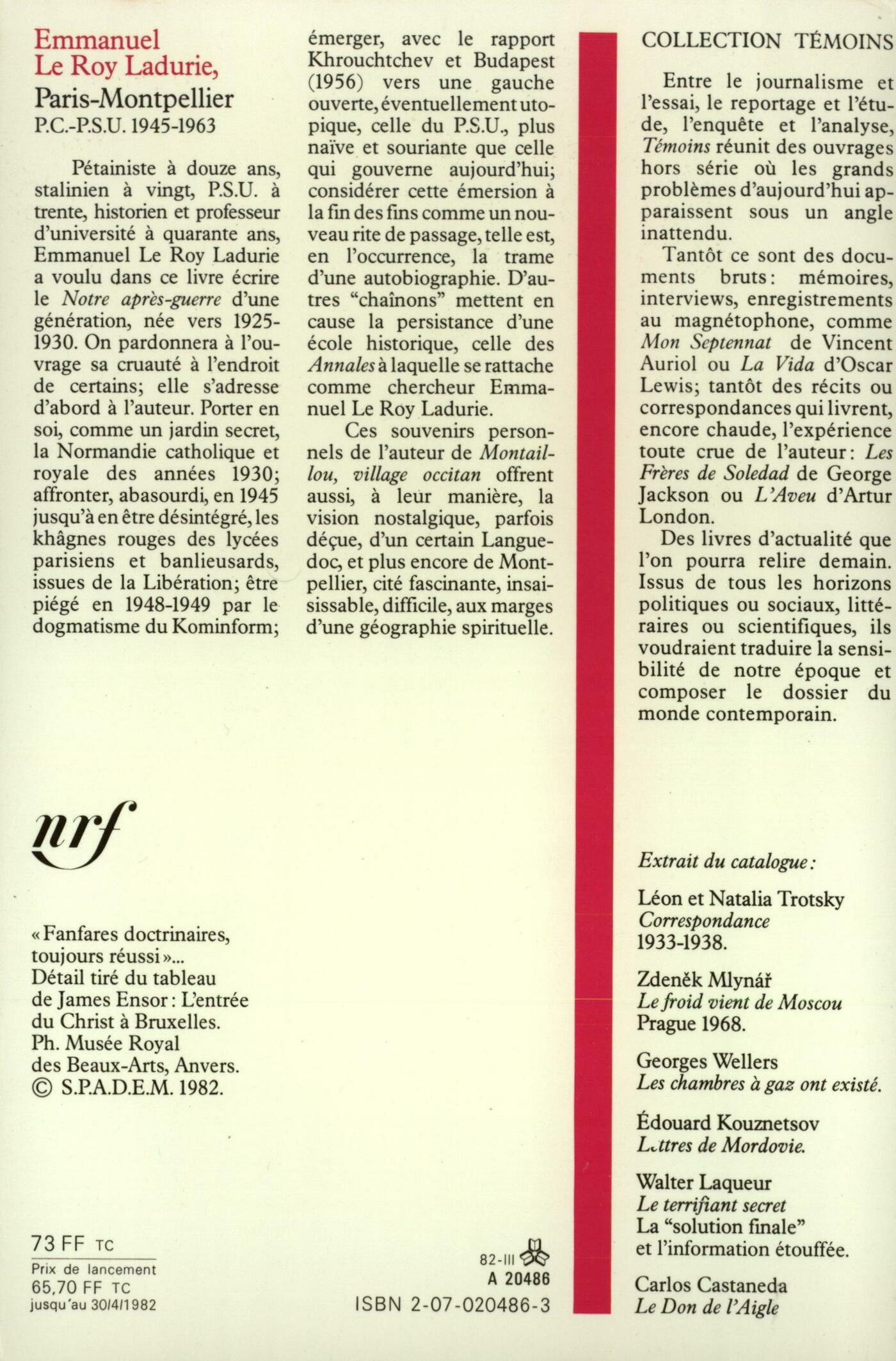 Pétainiste à douze ans, stalinien à vingt, P.S.U. à trente, historien et professeur d'université à quarante ans, Emmanuel Le Roy Ladurie a voulu dans ce livre écrire le Notre après-guerre d'une génération née vers 1925-1930. On pardonnera à l'ouvrage sa cruauté à l'endroit de certains ; elle s'adresse d'abord à l'auteur. Porter en soi, comme un jardin secret, la Normandie catholique et royale des années 1930 ; affronter, abasourdi, en 1945 jusqu'à en être désintégré, les khâgnes rouges des lycées parisiens et banlieusards, issues de la Libération ; être piégé en 1948-1949 par le dogmatisme du Kominform ; émerger, avec le rapport Khroutchev et Budapest (1956) vers une gauche ouverte, éventuellement utopique, celle du P.S.U., plus naïve et souriante que celle qui gouverne aujourd'hui ; considérer cette émersion à la fin des fins comme un nouveau rite de passage, telle est, en l'occurrence, la trame d'une autobiographie. D'autres 'chaînons' mettent en cause la persistance d'une école historique, celle des Annales à laquelle se rattache comme chercheur Emmanuel Le Roy Ladurie.Ces souvenirs personnels de l'auteur de Montaillou, village occitan offrent aussi, à leur manière, la vision nostalgique, parfois déçue, d'un certain Languedoc, et plus encore de Montpellier, cité fascinante, insaisissable, difficile, aux marges d'une géographie spirituelle.