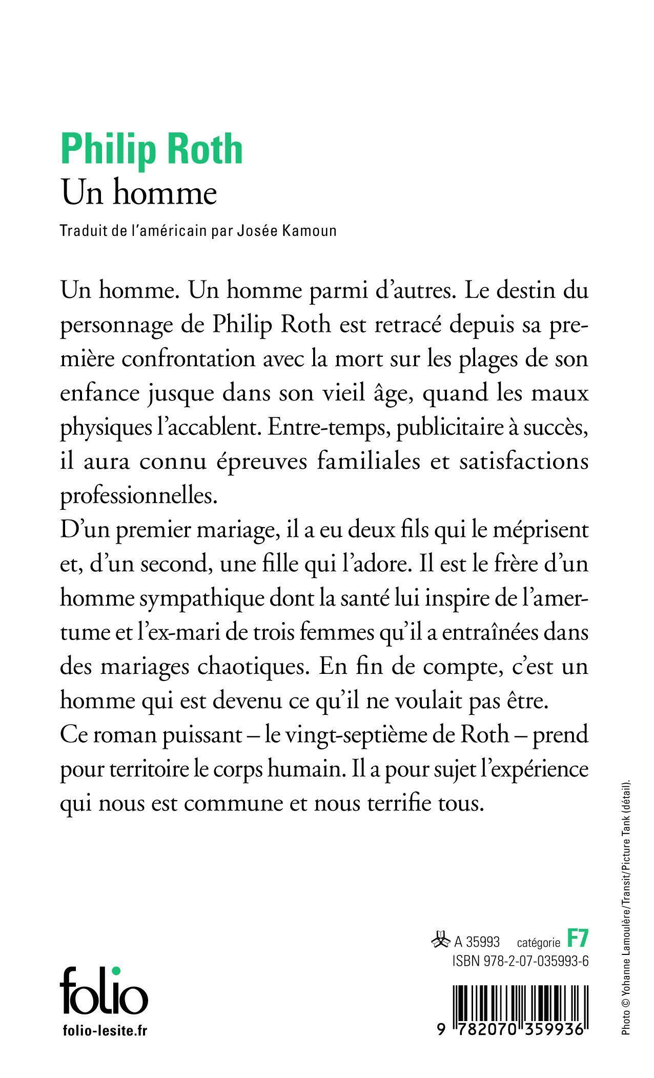 Un homme. Un homme parmi d'autres. Le destin du personnage de Philip Roth est retracé depuis sa première et terrible confrontation avec la mort sur les plages idylliques de son enfance jusque dans son vieil âge, quand le déchire la vision de la déchéance de ses contemporains et que ses propres maux physiques l'accablent. Entre temps, publicitaire à succès dans une agence à New York, il aura connu épreuves familiales et satisfactions professionnelles. D'un premier mariage, il a eu deux fils qui le méprisent et, d'un second, une fille qui l'adore. Il est le frère bien-aimé d'un homme sympathique dont la santé vigoureuse lui inspire amertume et envie et l'ex-mari de trois femmes, très différentes, qu'il a entraînées dans des mariages chaotiques. En fin de compte, c'est un homme qui est devenu ce qu'il ne voulait pas être. Ce roman puissant – le vingt-septième de Roth – prend pour territoire le corps humain. Il a pour sujet l'expérience qui nous est commune et nous terrifie tous.