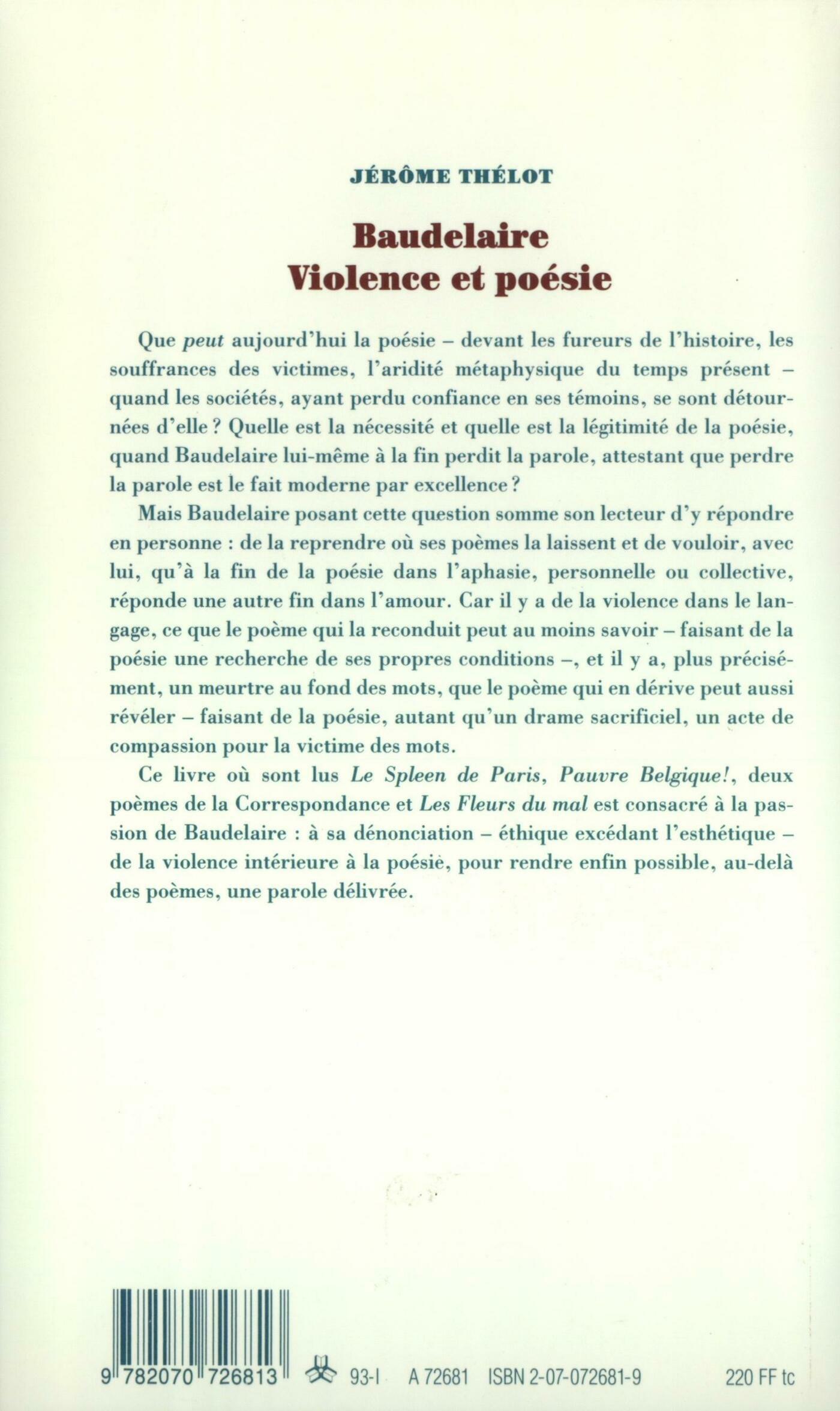 Que peut aujourd'hui la poésie - devant les fureurs de l'histoire, les souffrances des victimes, l'aridité métaphysique du temps présent - quand les sociétés, ayant perdu confiance en ses témoins, se sont détournées d'elle ? Quelle est la nécessité et quelle est la légitimité de la poésie, quand Baudelaire lui-même à la fin perdit la parole, attestant que perdre la parole est le fait moderne par excellence ?Mais Baudelaire posant cette question somme son lecteur d'y répondre en personne : de la reprendre où ses poèmes la laissent et de vouloir, avec lui, qu'à la fin de la poésie dans l'aphasie, personnelle ou collective, réponde une autre fin dans l'amour. Car il y a de la violence dans le langage, ce que le poème qui la reconduit peut au moins savoir - faisant de la poésie une recherche de ses propres conditions -, et il y a, plus précisément, un meurtre au fond des mots, que le poème qui en dérive peut aussi révéler - faisant de la poésie, autant qu'un drame sacrificiel, un acte de compassion pour la victime des mots.Ce livre où sont lus Le Spleen de Paris, Pauvre Belgique !, deux poèmes de la Correspondance et Les Fleurs du mal est consacré à la passion de Baudelaire : à sa dénonciation - éthique excédant l'esthétique - de la violence intérieure à la poésie, pour rendre enfin possible, au-delà des poèmes, une parole délivrée.