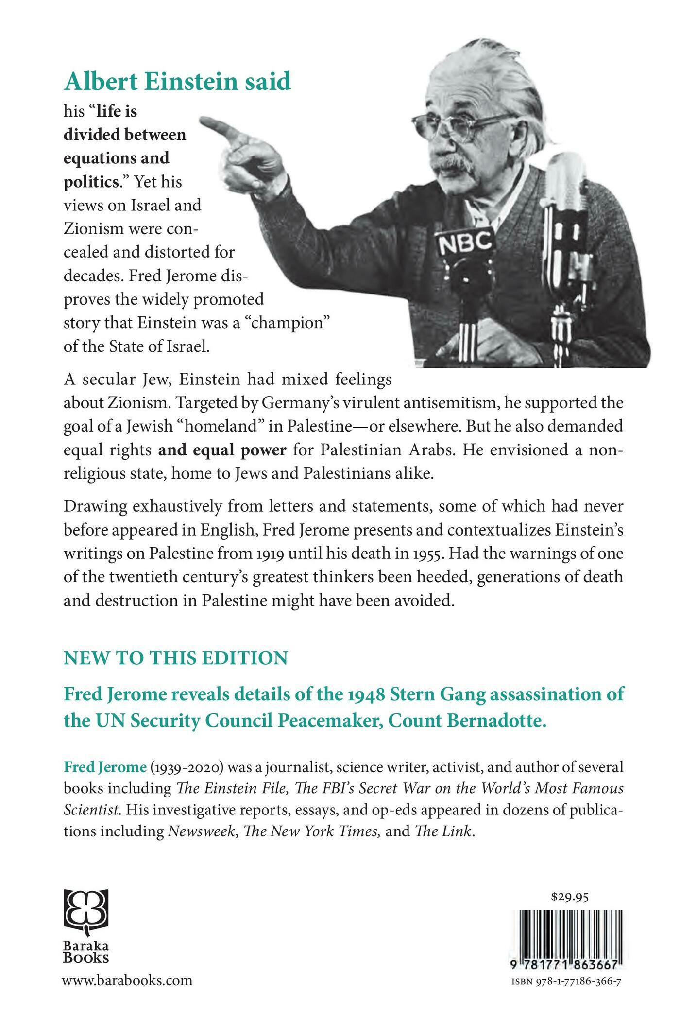 Albert Einstein said his “life is divided between equations and politics.” Yet his views on Israel and Zionism were concealed and distorted for decades. Fred Jerome disproves the widely promoted story that Einstein was a “champion” of the State of Israel.A secular Jew, Einstein had mixed feelings about Zionism. Targeted by Germany’s virulent antisemitism, he supported the goal of a Jewish “homeland” in Palestine—or elsewhere. But he also demanded equal rights and equal power for Palestinian Arabs. He envisioned a nonreligious state, home to Jews and Palestinians alike.Drawing exhaustively from letters and statements, some of which had never before appeared in English, Fred Jerome presents and contextualizes Einstein’s writings on Palestine from 1919 until his death in 1955. Had the warnings of one of the twentieth century’s greatest thinkers been heeded, generations of death and destruction in Palestine might have been avoided.NEW TO THIS EDITIONFred Jerome reveals details of the 1948 Stern Gang assassination of the UN Security Council Peacemaker, Count Bernadotte.Fred Jerome (1939-2020) was a journalist, science writer, activist, and author of several books including The Einstein File, The FBI’s Secret War on the World’s Most Famous Scientist (Baraka Books, 2018) and Einstein on Race and Racism. His investigative reports or op-ed pieces appeared in dozens of publications including Newsweek, The New York Times and The Link. As a reporter in the South during the early 1960s, he covered the explosive civil rights movement. He also taught at Columbia Journalism School, NYU and numerous other New York-area Universities.Reviews and Praise“Adds a new . . . how do they say it . . . dimension to Einstein's character.” Thomas Pynchon“Fred Jerome’s Einstein on Israel and Zionism is a valuable and timely contribution. Einstein’s views of Zionisme were prescient.” Sivan S. Schweber, Author of Einstein and Oppenheimer and In the Shadow of the Bomb“Reading the newly revealed correspondence in Fred Jerome’s book makes it clear that Einstein was a social commentator and humanitarian with a worldview worthy of his scientific genius. It’s a pity that the Zionist movement as embodied in the State of Israel took a direction so divergent from the path advocated by the Jewish people’s greatest intellect.” Michael Palumbo, author of The Palestinian Catastrophe and Imperial Israel"Albert Einstein is all-too often depicted as a naïf about politics; he was anything but that. He followed international and national politics assiduously, corresponded with leaders and ordinary people, and brought a passionate moral stance to the whole, fighting antisemitism, racism, fascism, and nationalism. In this volume, Fred Jerome has assembled a myriad of documents bearing on Einstein's views of Zionism. Telegrams, letters, magazine articles, interviews, all contribute to a dense and heartfelt analysis of what it would mean to avoid the pitfalls of dogmatic nationalism, and to create a Jewish homeland utterly respectful of Palestinian rights and equality. Of course, Einstein's physics speaks to us still; astonishingly, we can still learn from his moral-political reflections." Peter Galison, author of Einstein's Clocks, Poincare's Maps and Image and Logic“Einstein on Israel and Zionism is a welcome and necessary contribution to the discussions about the Middle East crisis. You do not have to be a genius in order to understand the gravity of the situation, but it is essential to listen to one, especially if his name was Einstein. His thoughts make for fascinating reading, allow us new insights into the mind of one of the 20th centurys greatest thinkers and remind us that it is never too late." Avraham Burg, author of The Holocaust is Over; We Must Rise From Its Ashes*ABOUT THE FIRST EDITIONSt. Martin's Press published the first edition of Einstein on Israel and Zionism. Soon out of print, it was never reprinted and never made into an ebook. As a result, it is very hard to find. Baraka Books is thrilled to bring out this new enriched edition and is very grateful to Fred Jerome's widow, Jocelyn Jerome, who granted us the right to bring out a new edition.