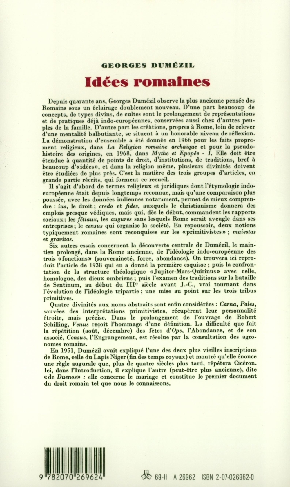 Depuis trente ans, Georges Dumézil observe la plus ancienne pensée des Romains sous un éclairage doublement nouveau. D'une part beaucoup de concepts, de types divins, de cultes sont le prolongement de représentations et de pratiques déjà indo-européennes, conservées aussi chez d'autres peuples de la famille. D'autre part, les créations, propres à Rome, loin de relever d'une mentalité balbutiante, se situent à un honorable niveau de réflexion. La démonstration d'ensemble a été donnée en 1966 pour les faits proprement religieux, dans La Religion romaine archaïque et pour la pseudo-histoire des origines, en 1968, dans Mythe et Épopée, I. Elle doit être étendue à quantité de points de droit, d'institutions, de traditions, bref à beaucoup d'«idées», et dans la religion même, plusieurs divinités doivent être étudiées de plus près. C'est la matière des trois groupes d'articles, en grande partie récrits, qui forment ce recueil.