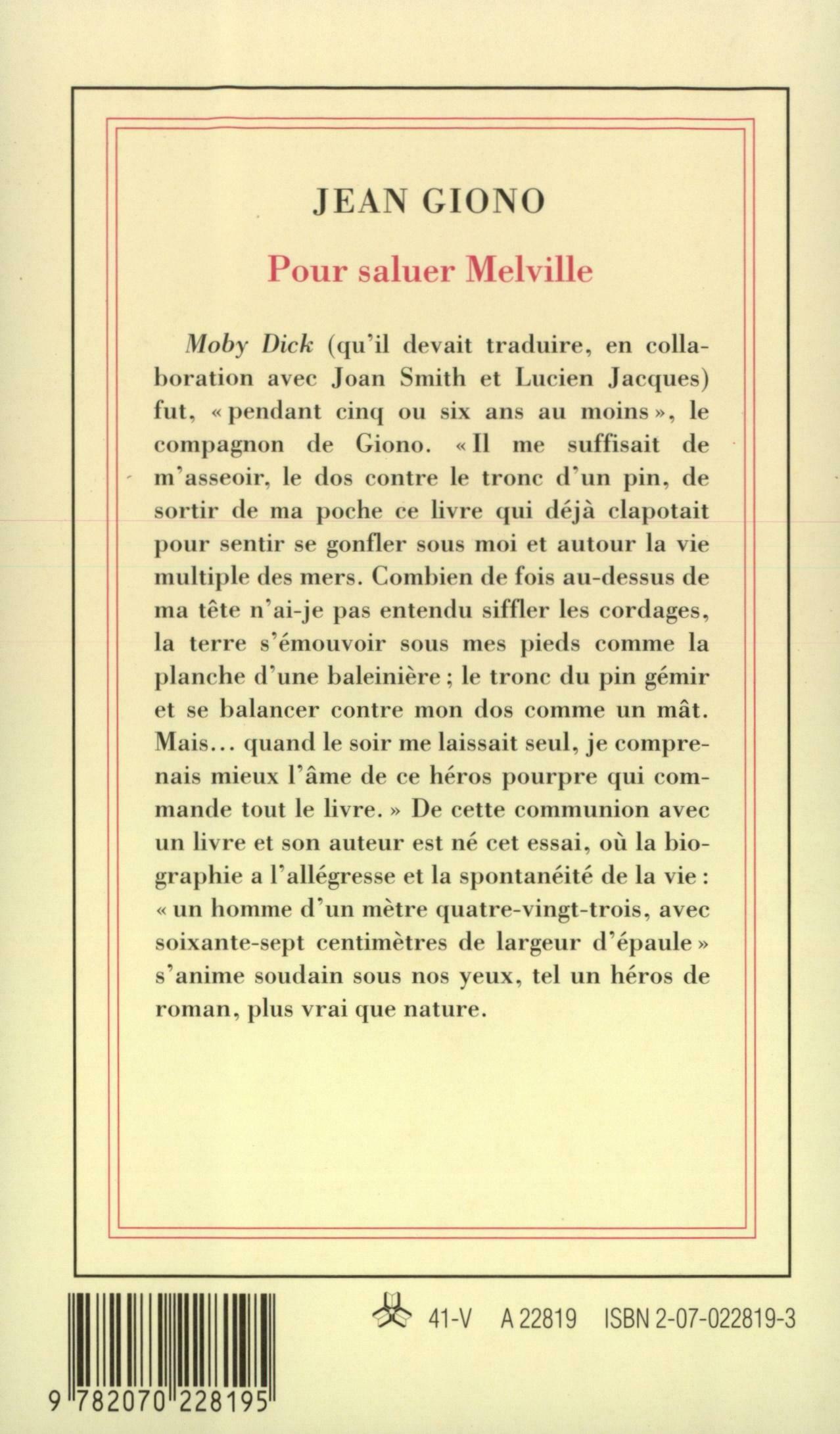 Moby Dick (qu'il devait traduire, en collaboration avec Joan Smith et Lucien Jacques) fut, "pendant cinq ou six ans au moins", le compagnon de Giono. "Il me suffisait de m'asseoir, le dos contre le tronc d'un pin, de sortir de ma poche ce livre qui déjà clapotait pour sentir se gonfler sous moi et autour la vie multiple des mers. Combien de fois au-dessus de ma tête n'ai-je pas entendu siffler les cordages, la terre s'émouvoir sous mes pieds comme la planche d'une baleinière ; le tronc du pin gémir et se balancer contre mon dos comme un mât. Mais... quand le soir me laissait seul, je comprenais mieux l'âme de ce héros pourpre qui commande tout le livre." De cette communion avec un livre et son auteur est né cet essai, où la biographie a l'allégresse et la spontanéité de la vie : "un homme d'un mètre quatre-vingt-trois, avec soixante-sept centimètres de largeur d'épaule" s'anime soudain sous nos yeux, tel un héros de roman, plus vrai que nature.