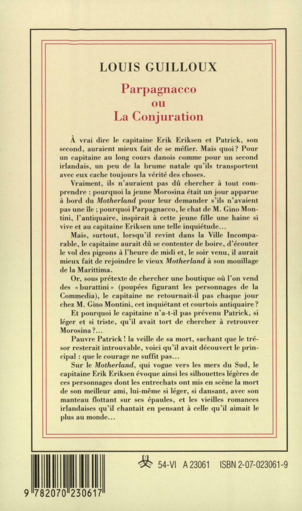 À vrai dire le capitaine Erik Eriksen et Patrick, son second, auraient mieux fait de se méfier. Mais quoi? Pour un capitaine au long cours danois comme pour un second irlandais, un peu de la brume natale qu'ils transportent avec eux cache toujours la vérité des choses. Vraiment, ils n'auraient pas dû chercher à tout comprendre : pourquoi la jeune Morosina était un jour apparue à bord du Motherland pour leur demander s'ils n'avaient pas une île ; pourquoi Parpagnacco, le chat de M. Gino Montini, l'antiquaire, inspirait à cette jeune fille une haine si vive et au capitaine Eriksen une telle inquiétude... Mais, surtout, lorsqu' il revint dans la Ville Incomparable, le capitaine aurait dû se contenter de boire, d'écouter le vol des pigeons à l'heure de midi et, le soir venu, il aurait mieux fait de rejoindre le vieux Motherland à son mouillage de la Marittima. Or, sous prétexte de chercher une boutique où l'on vend des 'burattini' (poupées figurant les personnages de la Commedia), le capitaine ne retournait-il pas chaque jour chez M. Gino Montini, cet inquiétant et courtois antiquaire? Et pourquoi le capitaine n'a-t-il pas prévenu Patrick, si léger et si triste, qu'il avait tort de chercher à retrouver Morosina?... Pauvre Patrick! la veille de sa mort, sachant que le trésor resterait introuvable, voici qu'il avait découvert le principal : que le courage ne suffit pas... Sur le Motherland, qui vogue vers les mers du Sud, le capitaine Erik Eriksen évoque ainsi les silhouettes légères de ces personnages dont les entrechats ont mis en scène la mort de son meilleur ami, lui-même si léger, si dansant, avec son manteau flottant sur ses épaules, et les vieilles romances irlandaises qu'il chantait en pensant à celle qu'il aimait le plus au monde...