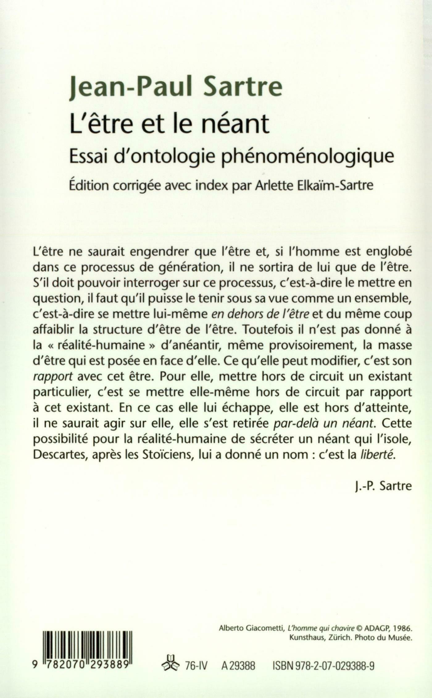 L’être et le néant est un des textes majeurs de la deuxième moitié du XXe siècle. Jean-Paul Sartre (1905-1980) y pose les fondations de l’existentialisme : si Dieu n’existe pas, l’homme ne trouve ni en lui, ni hors de lui, des excuses ou des valeurs auxquelles s’accrocher; dès lors que l’existence précède l’essence, nul ne peut se réfugier derrière une nature humaine donné et figée. Où qu’il regarde, l’homme est seul, sans excuses, condamné à être libre. "L'être ne saurait engendrer que l'être et, si l'homme est englobé dans ce processus de génération, il ne sortira de lui que de l'être. S'il doit pouvoir interroger sur ce processus, c'est-à-dire le mettre en question, il faut qu'il puisse le tenir sous sa vue comme un ensemble, c'est-à-dire se mettre lui-même en dehors de l'être et du même coup affaiblir la structure d'être de l'être. Toutefois il n'est pas donné à la "réalité humaine" d'anéantir, même provisoirement, la masse d'être qui est posée en face d'elle. Ce qu'elle peut modifier, c'est son rapport avec cet être. Pour elle, mettre hors de circuit un existant particulier, c'est se mettre elle-même hors de circuit par rapport à cet existant. En ce cas elle lui échappe, elle est hors d'atteinte, il ne saurait agir sur elle, elle s'est retirée par-delà un néant. Cette possibilité pour la réalité humaine de sécréter un néant qui l'isole, Descartes, après les Stoïciens, lui a donné un nom : c'est la liberté."